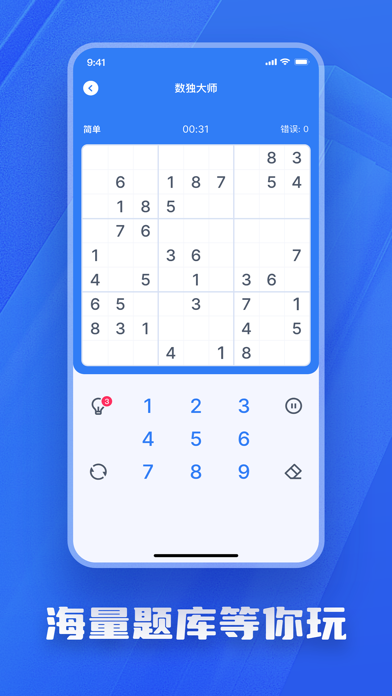 数独是源自18世纪瑞士的一种数学游戏。是一种运用纸、笔进行演算的逻辑游戏。玩家需要根据9×9盘面上的已知数字,推理出所有剩余空格的数字,并满足每一行、每一列、每一个粗线宫(3*3)内的数字均含1-9,不重复。 数独盘面是个九宫,每一宫又分为九个小格。在这八十一格中给出一定的已知数字和解题条件,利用逻辑和推理,在其他的空格上填入1-9的数字。使1-9每个数字在每一行、每一列和每一宫中都只出现一次,所以又称“九宫格”。修复一些BUG