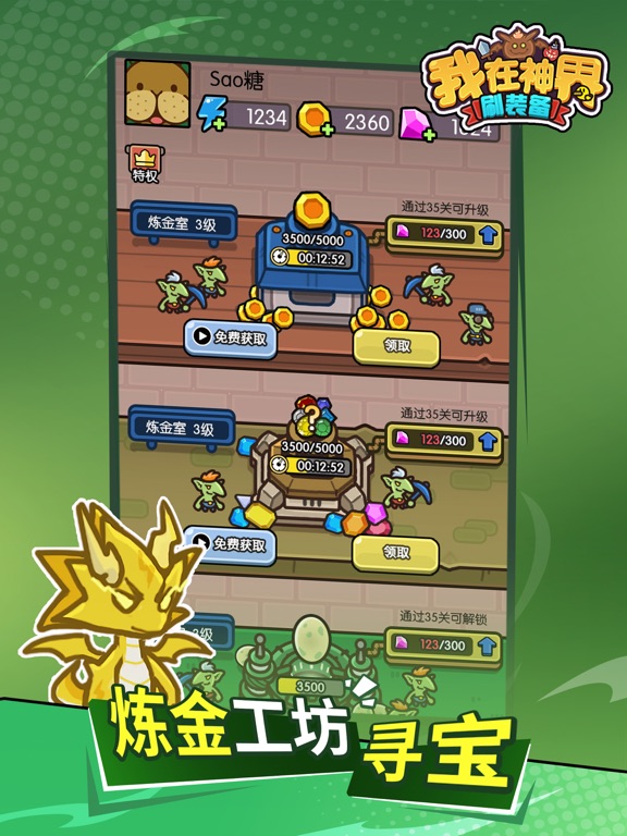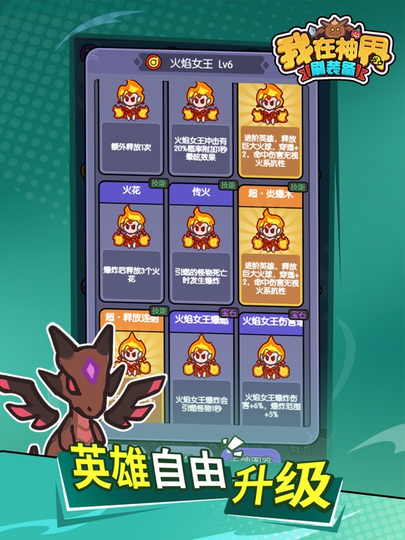 全新塔防+Roguelike策略游戏《我在神界刷装备》现已上线! 上手容易,老少皆宜,趣味无穷; 操作简单,技能选择,搭配过关; 技能种类丰富,升级特效炫酷,战斗体验爽快; 宝石掉落随机,惊喜也许就在下壹秒; 玩法丰富:城墙搭建,升级英雄,精炼装备,深渊闯关等应有尽有~2.18 版本更新内容: 皮肤 -- 新增火焰女王第三代皮肤 "霜焰魔女" 皮肤 -- 新增山岭巨人第三代皮肤 "幽冥使者" 皮肤 -- 新增德鲁伊第三代皮肤 "风暴魔女" 皮肤 -- 新增奥术游侠第三代皮肤 "荒漠女警" 符石 -- 新增符石溢出经验转化为道具“经验符石” 符石 -- 新增2个专属红色绝世符石 神器 -- 新增神器 "圣剑(物理系)" 运营活动 -- 新增限时活动 ”万圣狂欢“ 赛季关卡 -- 新增赛区关卡,从405关拓至410关 主题界面 -- 新增万圣节主题界面 新手引导 -- 优化初期新手引导提示 炼金工坊 -- 优化炼金工坊的数值 宝石视频 -- 优化特殊宝石中英雄展示视频 性能优化 -- 针对部分渠道的卡顿问题进行优化