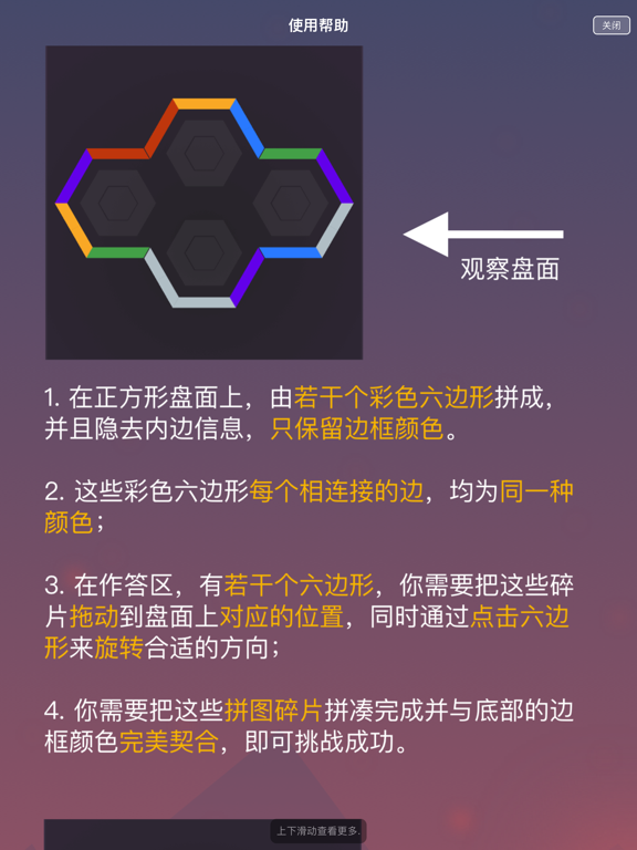 C60迷阵 是一款观察记忆的推理项目,同时也是最强大脑第八季同款游戏。 玩法说明: 1. 在正方形盘面上,由若干个彩色六边形拼成,并且隐去内边信息,只保留边框颜色。 2. 这些彩色六边形每个相连接的边,均为同一种颜色; 3. 在作答区,有若干个六边形,你需要把这些碎片拖动到盘面上对应的位置,同时通过点击六边形来旋转合适的方向; 4. 你需要把这些拼图碎片拼凑完成并与底部的边框颜色完美契合,即可挑战成功。 准备好了么?赶紧一起来我们全新谜题世界里面冒险吧!- 全新美术设计风格 - 优化部分游戏体验