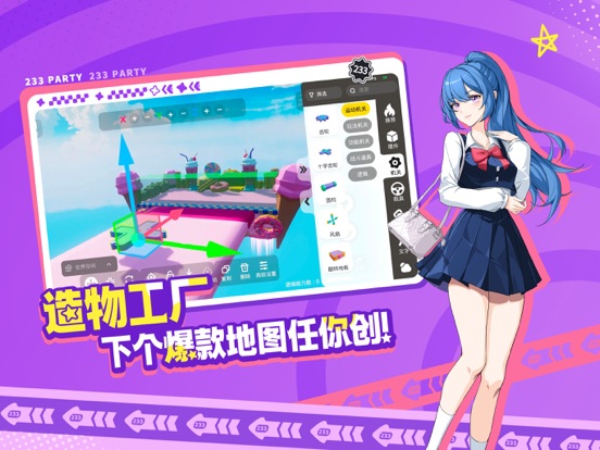 想要产出自己的3D作品,但却不会编程也不会建模? 小~意思!只要你有创意,其他的就交给我们来解决! 你还可以和志同道合的小伙伴一起交流想法,分享作品,让你的作品不仅有人玩,还能收获满满的点赞与支持! 来 233 派对,亲手打造属于自己的 3D 作品! 【轻松上手,小白秒变 3D 大神】 新人瑟瑟发抖?我们懂你!操作方法简单明了,第一次上手也能快速 get 诀窍。搭场景、放机关、做专属武器、写角色技能,全程没压力,分分钟做出超酷的作品,成就感拉满! 【创意丰富,天才脑洞即刻实现】 主题创作活动持续上新,20 + 玩法模板任你选,再也不怕没有好点子!灵光乍现,点子多到用不完?空白模板供你自由发挥想象力!想造个会发光的奇幻冒险世界?安排!想设计紧张到心跳加速的赛车竞技场?没问题!复刻你最喜欢的动画名场面?完全可以!在这里,你的每一个奇思妙想都能变成超赞的作品。 【海量资源,创作效率 up up】 无需从头制作素材,海量资源库任你调用,丰富的模型和效果让创作更加高效。你还可以在资源商店上架由你创作的素材,与其他小伙伴交流分享,学习大家的创意与技巧,快速提升作图能力! 【创作社区,与小伙伴共同进步】 加入社区,成为万千创作者中的一员!这里全是和你一样爱创作的小伙伴!与志同道合的小伙伴交流创作经验,甚至组队合作,共同完成一款令人惊叹的作品。分享你的精彩作品,收获超多点赞和夸奖,收集 bug 反馈和改进建议…… 每一次互动,都是灵感的火花! 【顶级功能,解锁无限创作可能】 从基础玩法到复杂机制,从单机体验到多人参与,我们的编辑器为你提供天花板级的强大功能支持,让你的创作自由无拘!无论是简单的跑酷地图,还是复杂的 3D 冒险世界,你都能轻松驾驭!修复已知bug,优化体验问题