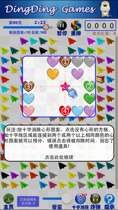 ^风靡网络的飞机小游戏, 一个手指即可操作(免费)^ 现在可以每日签到送道具啦! 我们特地针对iPad/iPhone设计了不同的游戏界面,祝您玩得开心! iPad的界面建议两人同玩,更有乐趣! 友情提示:如果遇到某一关一开始就退出,可以尝试用主界面右下角的选关功能 选择其他关卡正常游戏十多秒后再重新选择上次的关卡。 玩法 在规定时间内,点击空格,只要是十字线能连接到的相同颜色的心形图案,就能被消除并获得分数奖励。如果点击后没有能够消除的心形图案,会被扣除时间。 关卡 我们设计了很多关卡,难度逐渐增加,您也可以选择玩过的关卡重新挑战,以获取更高的得分。 排行榜 我们特地为每一关得分和所有关总分设立了不同的排行榜,这样玩家们可以相互切磋,挑战极限! 道具 游戏中一共有提示、炸弹、十字消除3种道具,有的是限时使用,有的是计数使用,您可以灵活组合他们,以得到高分:) 小贴士: 每天第一次开始游戏时,根据你前一天的游戏过程,是可以获得相应的限量道具奖励的,努力!修复了一些小问题
