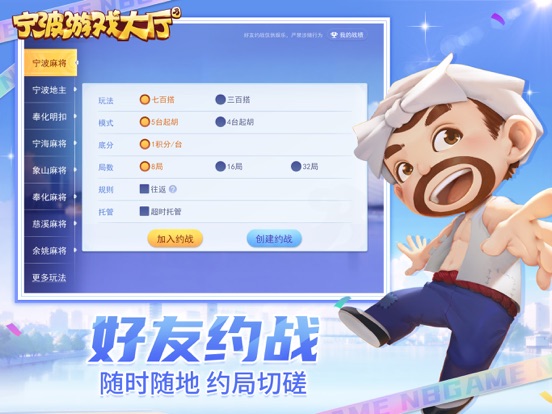 《宁波游戏大厅》阿拉宁波人自己的游戏! 【花样玩法】 三人地主、宁波地主、舟山清墩...真人对局,总有一款适合你! 奉化明扣、千变双扣、超级关牌...组队协作,斗智斗勇! 宁波/奉化/象山/慈溪/余姚/宁海/北仑/舟山...本地麻将,妙趣横生~ 【正宗规则】 方言配音,地道打法,还原纯正的热血对局! 休闲模式,好友约战,闲暇时间来一把! 【免费领奖】 天天壕礼,悬赏任务,凭实力,赢奖品! 领奖中心,花样福利,玩游戏,拿奖励! 【电视赛事】 高手争霸,公平竞技! 参与海选,直通《开心大赢家》《第5擂台》《牌轩下茶馆》电视赛!1、新增三人地主、千变双扣、舟山清墩、定海麻将,更有游戏等你来~ 2、好友约战更新啦!更多可选玩法,赶紧邀请好友来一局! 3、7.8棋牌文化节即将来袭,海量福利,阿财周边免费送,敬请期待!