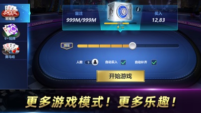 天天欢乐德州致力于提供最真实和最专业的德州扑克游戏体验,与来自世界各地的真实德州扑克玩家一起,在游戏中竞技,随时随地享受与真人博弈的乐趣,成为更好的德州扑克玩家! 游戏特色: 德州扑克区别于炸金花/牛牛/百家乐/龙虎斗等这些在概率下赌胜负的棋牌玩法,是一种易入门难精通的脑力竞技运动。通过对手的行为和心理分析加上数学概率计算,制定最优的打法策略。玩德州扑克能全面锻炼一个人的定力,眼力,算力,魄力以及风控能力。 玩法全面:包括最经典的无限注德州扑克玩法以及奥马哈,6+短牌其他广受欢迎的扑克玩法,还有AOF模式的趣味扑克玩法。总有一款德州扑克玩法适合你。 模式丰富:奖励丰富的锦标赛随时开赛!击败所有的竞争对手,赢得巨额奖金;加入SNG快速比赛,赢得独一无二的奖杯或数百万筹码!在适合自己的级别,随时随地开启你的传奇之路, 保证公平:我们的所有游戏使用的随机数生成器获得了国际权威机构GLI的随机算法认证,保证玩家获得最佳和最公平的德州扑克体验! 特色活动:了解更多精彩、精彩和独家扑克内容。更多扑克桌,扑克手,扑克挑战,扑克卡奖金,免费筹码活动等等!更多的福利,更多的快乐! 尊贵VIP:通过获得更高级别的VIP会员资格,获得更多游戏内福利、功能和奖励。享受独家筹码和钻石折扣和特殊扑克游戏模式。 即时互动:通过我们方便的游戏内即时消息和动画表情符号,在赌场的桌子上玩得更开心。与你的扑克对手和朋友分享你的情绪! 完整档案:与朋友分享您的成功。展示你的比赛数据,级别,卡片收藏,成就,财产和奖杯等等! 迷你老虎机游戏:游戏中不仅仅只与人紧张博弈。游玩迷你老虎机游戏,挑战你的运气,享受片刻的轻松,超级大奖就在休憩之中。 本游戏仅供成年人(18+)娱乐,此扑克游戏面向成年玩家,游戏不涉及任何赌博功能,您能在游戏内用真实货币购买虚拟物品以进行各种游戏体验,但不提供真金白银赌博的机会,玩家不能通过游戏赢得真实货币,一切游戏道具仅限在游戏内使用。在游戏内的实践成功并不意味着未来现实中行为的成功。1.新增“双十一”活动. 2.修复已知bug,优化性能.