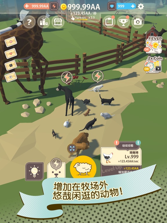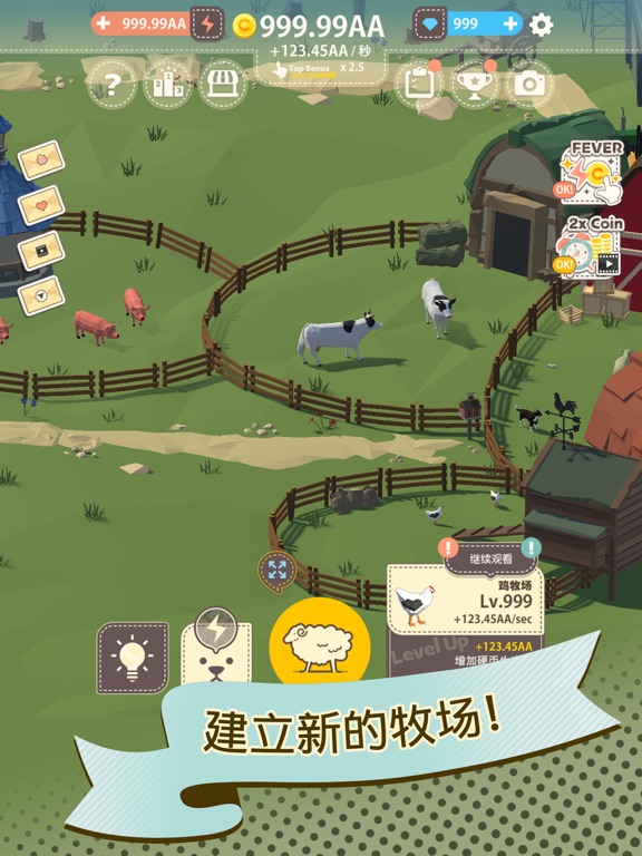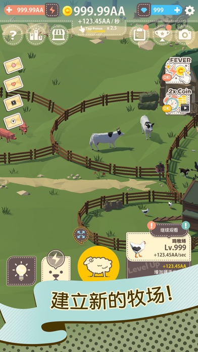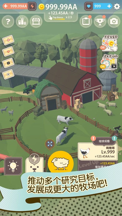 与众多动物们一起过上牧场生活! 增加羊只的数量让牧场变得更加热闹吧! 只要点击画面就可以简单轻松地经营牧场! 还不快来帮忙!?!? 接手没有任何管理者的牧场开始进行牧场经营的工作! 只要点击按钮呼唤羊,让羊从小屋移动到他处就能取得硬币! 只要呼唤出更多的羊,就可以更快更轻松地取得硬币!? 而且只要开拓容纳新动物的牧场,就能够自动收集硬币! 享受自动赚钱的悠闲放置生活! 不只有牧场而已! 您还可以增加超多能够自由闲晃的动物! 让各式各样的动物自由散步,建立一个热闹又繁荣的牧场吧! 越是研究的话牧场经营也会变得更为轻松!? 除了收益增加、减少所需硬币外,外观也可以变得更加豪华,让您的牧场成长为一座大型牧场吧! 轻松又简单,只要点击画面就可以经营牧场! 增加羊只赚取硬币,还可以增加牧场自动收集硬币! 适合在夹缝时间里游玩的游戏!能够打发时间的放置点击游戏!中文版正式上架
