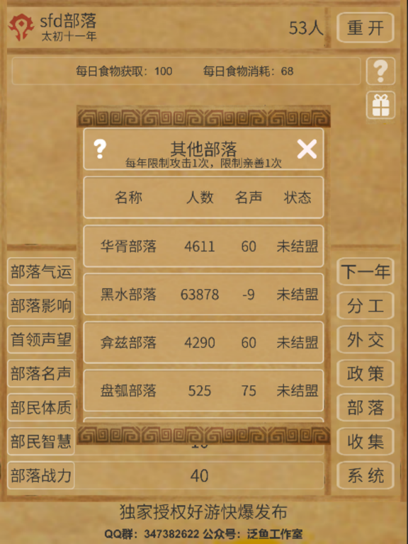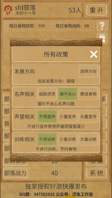 模拟经营远古部落,你来当首领,怎么分工,如何进行外交,如何制定政策,如何处理突发事件,都由你说了算,你的目标就是努力发展部落以迎接世纪洪水的考验。 官方QQ群:756614623 微信公众号:泛鱼工作室修复广告展示问题