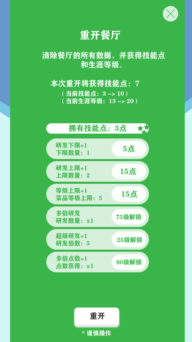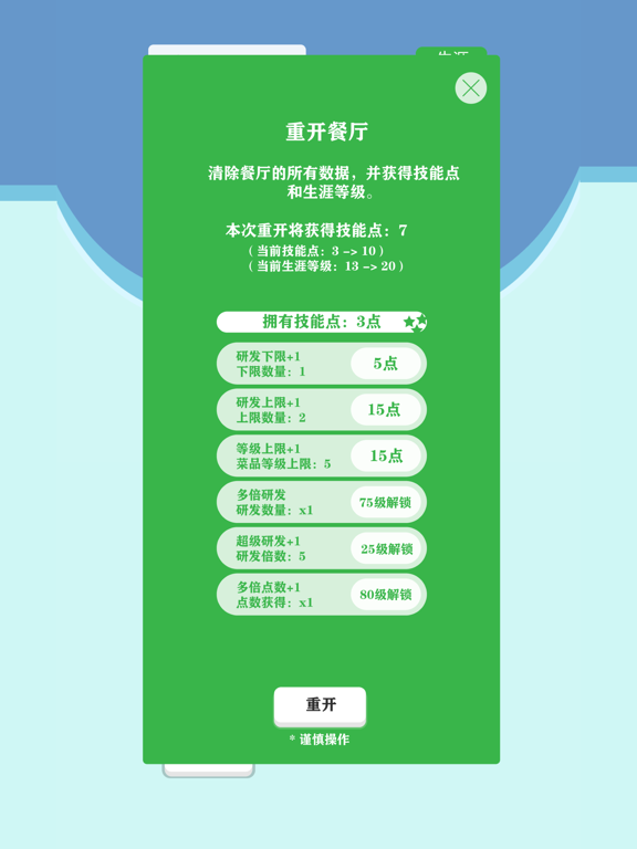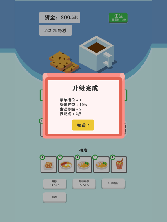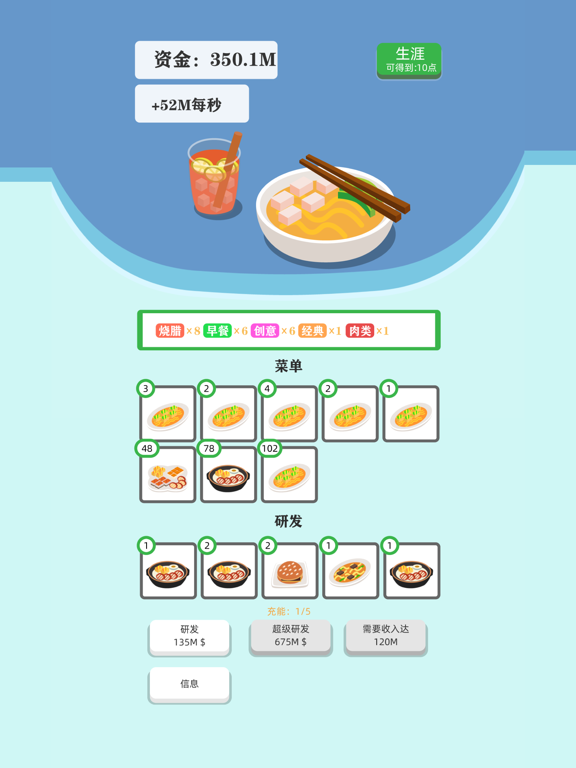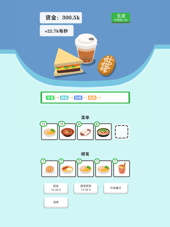 《最强茶餐厅》操作简单,玩法新颖,是一款数值经营的精品小游戏。 【玩法介绍】 首先,通过研发随机得到菜品,不断叠加菜品数量,获得更高的收益率。 其次,你需要组合你的菜品,通过【羁绊】获得收益加成。 拥有比较高的收入后,可以【升级餐厅】解锁更高收益的菜品。 【基本操作】 研发,获得多个菜品。 拖拽,将菜品进入菜谱栏,获得收入。 找到最赚钱的菜谱组合,将是你在游戏过程中的一个持续目标。 当收入将会遇到天花板,可以选择【重开餐厅】获得技能点,提升各项能力。 【菜品属性】 星级:相同菜品能叠加,达到一定数量将会升星,获得多倍的收益。 羁绊:每种菜品都有类别,同类别的菜品越多,收入加成越高。 【游戏元素】 升级餐厅:增加可研发的新菜品,和各式增益效果。 重开餐厅:重置本局的游戏数据,获得技能点和生涯等级。 技能点:升级你的技能,强化数值,提高各项经营能力。 这是一款适合打发时间,经久耐玩的数值游戏。 推荐给朋友一起玩,互相交流心得。 特色: - 流行精美的美术,充满深度的玩法 - 离开游戏期间,也能持续获得收入- 修复bug - 改善拖动表现