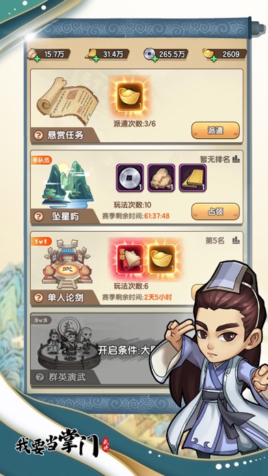 当上掌门,壮大门派,执剑江湖,开创属于自己的江湖神话。正所谓“剑起江湖啸恩仇”,这个江湖,由你来打造! ◆游戏特色◆ 【放置挂机,亲手建造门派】 作为掌门,开宗立派的责任在你的肩上,门派的兴盛在你的规划下。 【主线探险,踏足江湖恩怨】 掌门还需以身涉险?当然不用,安排弟子江湖游历门派就行。 【多种养成,弟子升级打怪】 修习武学,研习阵法,装备打造,外出游历,掌门送礼,弟子内外兼修提升实力。 【武学搭配,修炼精进造诣】 拳剑刀长兵奇门样样齐全,何种搭配方可叱咤武林,静待诸位掌门前来发掘!一、核心玩法保留与优化 经典系统重现:保留并优化了深受喜爱的核心玩法。 数值平衡调整:全面调整了战斗、养成、经济等系统的数值体系,追求更平衡、更具策略性的游戏体验。 二、成长体系重构 脉络清晰化:彻底重构了原先杂乱的成长路径,掌门、弟子、门派的培养路线现在更加清晰顺畅。 节奏优化:优化了各阶段的成长节奏,减少卡点,让您的掌门之路每一步都目标明确,充满正反馈。 流程简化:简化了诸如任务引导、建筑升级、合成等日常操作的步骤,节省您宝贵的时间。 三、其他优化与修复 解决了大量历史遗留的异常问题。 优化了游戏性能,减少了卡顿和闪退现象。