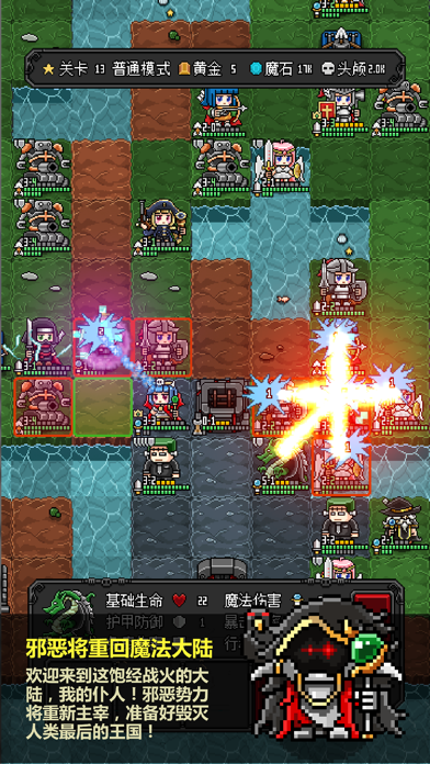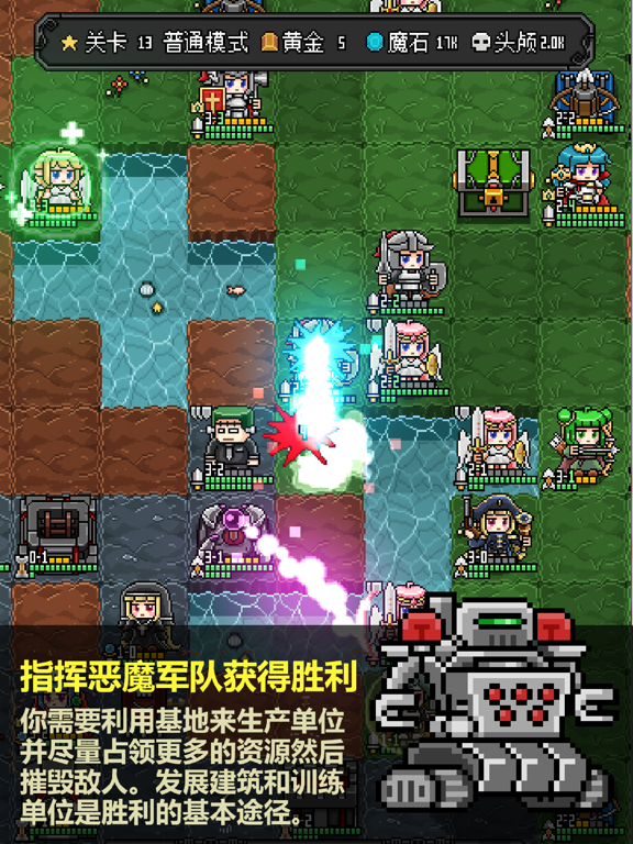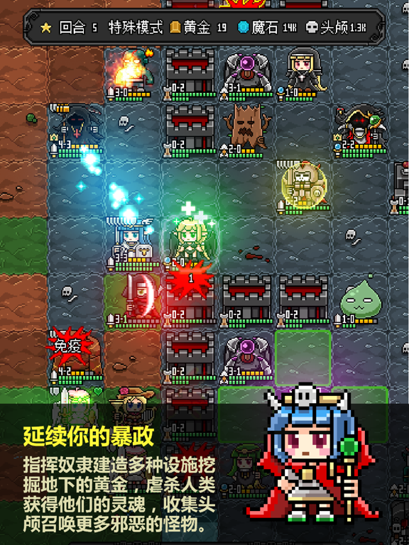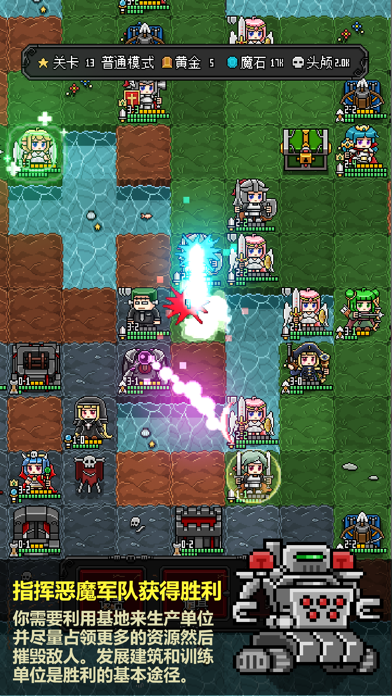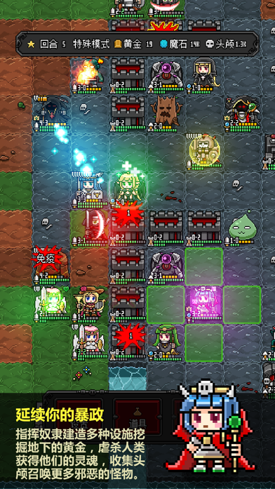 魔王已经被封印,勇者即将摧毁魔族最后的部落。在这危机时刻我迎来了你这位最后的守护者。现在邪恶将重回魔法大陆,我的仆人!延续你的暴政,指挥奴隶建造多种设施,挖掘地下的黄金,虐杀人类获得他们的灵魂,收集头颅召唤更多邪恶的怪物,准备好毁灭人类最后的王国! 这是一款像素战棋游戏,你将扮演魔族幸存者开启征服之路,指挥恶魔大军消灭人类的王国和家园。 游戏中有三种难度模式可供玩家选择,你需要做的是通过基地生产单位并且尽量占领更多的资源为魔族囤积更多的资本,然后摧毁敌人,你才能生存。想要获得胜利,你也需要发展各式的建筑和训练,为战争奠定胜利的基础。 根据英雄之间不同的特色选择召唤你最上手的英雄,升级他们不同的技能,使他们成为专属你的强力首领,召唤来的怪物也具有不同的特性,按其特色重新部署,运用不同战术作为攻击手段,带领他们征服世界! 近战和远程侍从可以获得晋升能力 新增一个特殊模式关卡 现在你可以选择禁用藏品了 修复了已知BUG添加了未知BUG