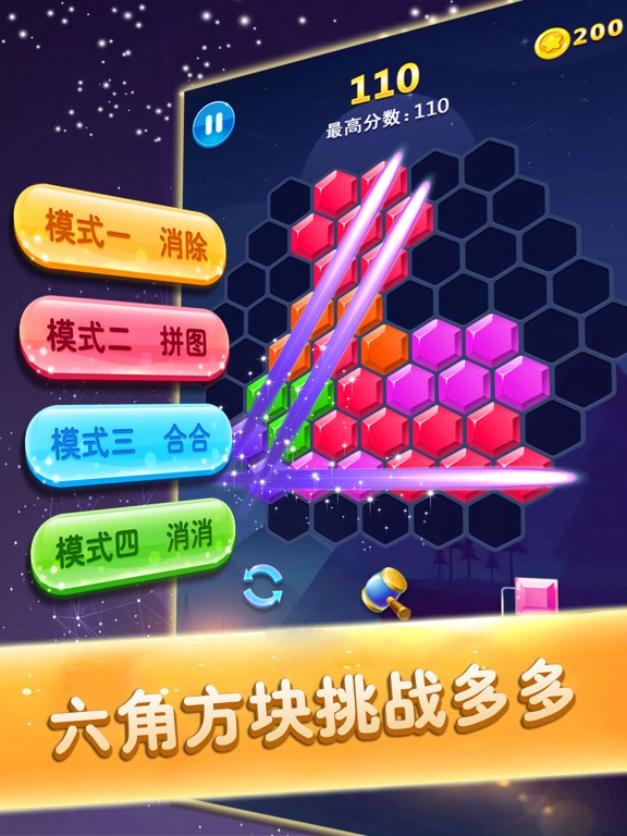 六边形的纵横变换,创意满满的智力大考验,六边形消除将带给你别具一格的消除盛宴!易懂 难精的多种创意玩法,益智耐玩的关卡设计,华丽的消除特效,带你走进六边形的世界,精彩 不容错过! 消除模式:拖动下方的六边形碎片到六边形棋盘中,创造并消除完整的一行或多行的线条,并 通过连击消除来获得更高的分数。 拼图模式:拖动下方的六边形小方块到不规则的多边形棋盘中,当拼凑出指定的多边形图形时 ,即可通关。 合合模式:拖动带有数字的六边形小方块到六边形棋盘中,3个以及更多相同数字的六边形块可 以合并成一个更高的数字块,当合成最高数字之后可以消除周围的几圈数字方块。 消消模式:玩法与合合模式相似,但是下方的六边形小方块可以旋转。 如果你还在苦恼闲暇时光无处打发,那就快来挑战这款充满魔力的六边形消除吧!抓住了一些Bug,现已修复