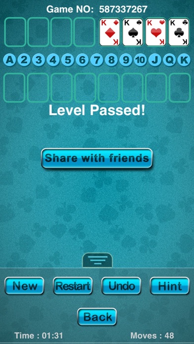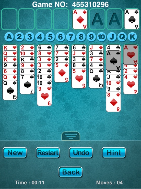 宽立接龙(FreeCell)是一款使用52张牌进行的单人卡片游戏,游戏目标是将整副牌搬到右上角的四个空栏中。 游戏规则: 将一副标准52张扑克牌洗牌,再分别置于8个栏目,其中4个栏目有7张纸牌,其余4个栏目有6张纸牌,每张扑克牌皆要以翻开显示。 另外还有四个本位栏框、四个空白栏框,本位栏框为四个放牌位置。纸牌 A 可立即放到本位栏框,而其他同花色的牌则可以由小到大依序叠上去。只要将所有的牌都放到本位栏框中,就成功了。空白栏框为四个放牌位置。每个栏框都可任意放一张纸牌。 移动纸牌的规则如下: * 将纸牌移动到某一栏时的顺序必须为由大到小,而且是不同的花色。 * 将纸牌移至本位栏框时,必须以相同花色,将牌按照从低(A)到高(K)的顺序移动。 * 某栏最底端的纸牌可移到空白栏框、另一栏的最底端或本位栏框。 * 空白栏框中的纸牌可移至某一栏的最底端或本位栏框。 支持的操作: * 先点一栏,再点另一栏,只要规则允许,就能把牌从第一次点中的栏移到另一栏; * 双击某栏的最后一张牌,只要有空位,就把此牌移到缓存位置; * 只要符合规则,可以把一张或多张牌从一栏拖到另一栏; * 只要符合规则,牌会自动扔进废弃区; * 可以拖动废牌到某栏,如果被自动废弃,可以点废牌和缓存中间的按钮切换菜单,撤销自动废弃; 加入自动扔牌功能,操作更加方便快捷,速度更快。 快来挑战吧!代码更新,自动仍牌