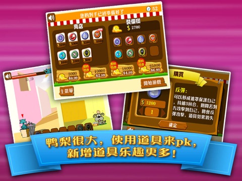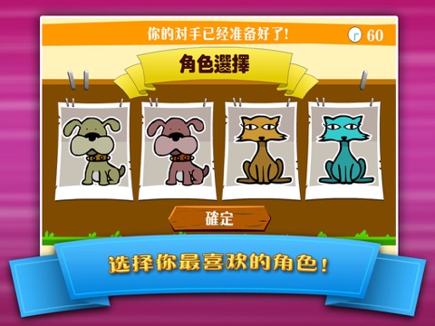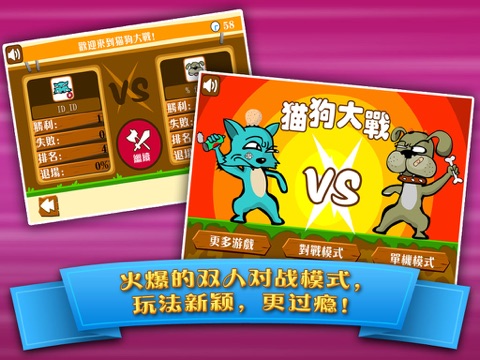 (猫狗大战)网络双人对战模式火爆上线了,新版新增多个有趣道具、双人真实PK,使游戏更刺激、更具挑战性! 游戏特色 *联机对战,使猫狗游戏更真实,更有乐趣! *互动性强,邀请好友一起pk更刺激! *每日登陆奖励、打折大礼包、每日抽奖,天天都有新惊喜! *微博分享还能获得额外的奖励! *好玩有趣的道具冰冻、烟雾、反弹等,使用道具PK更过瘾! *选择自己喜欢的角色来pk!支持iOS8
