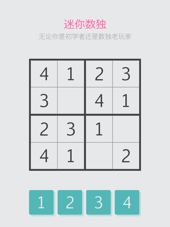 迷你数独: ■关于游戏 迷你数独游戏在玩法上是一个创新。 有别于传统的9×9个格子,迷你数独提供了4×4和6×6个格子的两种玩法。 无论你是初学者还是数独老玩家,都可以乐在其中。 ■为何这样设计 【迷你】可以缩短数独游戏时间,更适合随时随地的移动体验。 而且能不为屏幕内容拥挤所困,加强体验数独的乐趣。 ■移动平台的操作  - 传统数独游戏操作方法:按一下版面的空格,再按一下界面下排数字  - 迷你数独:一步直接拖动数字至版面即可 简单的改变操作方法,就降低了用户50%的动作,减缓了操作压力。 ■关卡 总共365×5=1825关卡,诚意满分。 迷你数独, 献给,喜欢每天小酌一会儿的玩家, 献给,数独迷新玩法的玩家, 献给,觉得移动平台屏幕无法玩完整数独的的玩家, 献给,想随时随地动动脑筋的玩家。 修正一个小 bug