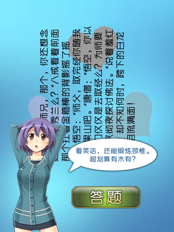人人都为笑话愁,我的名气有够臭,要问哪个最优秀,嘿~——颈椎美少女最最牛! —— 凤姐(菜市场豆腐摊主) 久闻颈椎美少女是讲冷笑话的高手,能够在有生之年玩到它,让我喜极而泣。 —— 周力波(8路公交车司机) 因为身体不适,无缘来中国拜会颈椎美少女,深感遗憾,望美少女在今后如果有日文版的发行时一定要让我看个够。 —— 龙泽螺拉 (日本无业人员) 一直以来,常常有记者和读者问我,为什么在工作闲暇总喜欢看颈椎美少女讲冷笑话。不管多么累,毕竟他是我一生的最爱。 —— 冯拱 (农民工) ——————————————— 都市白领们,你们久坐于电脑之前,长此以往,对颈椎可不好哦——颈椎美少女非常愿意帮助你们在工作之余保健你们的颈椎,让你的脖子每天都舒舒服服的。 “美少女颈椎保健大师”是一款既需要你活动身体又需要你开动脑筋的益智游戏,在充满挑战的智力闯关过程中,你需要有灵活的颈部协调能力及填满了百科知识的聪明大脑,才能在游戏中过关斩将,游刃有余。 ——————————————— 冷笑话例子 ——————————————— 刚才在公交车上,忽然听到身后咔咔摇微信的声音。我突然心生邪念,手机调成静音也摇,一看头像正是那货。于是发消息给他:“贫道每日一卦。今日算你在9路公交车上,抱一褐色皮包,请尽快下车,否则有血光之灾。”然后那货就下车了…… 当你看到办公室里的同事歪着脖子对着手机哈哈大笑,请不要惊讶,他一定正在玩“美少女颈椎保健大师”。颈椎美少女保证让你在他的保健室里放松颈部,开怀大笑,忘却一天中的各种烦恼。没错,颈椎美少女就是这么酷。 游戏特性: - 史上首款身体和大脑需要同时运动的保健游戏。 - 上百个精彩冷笑话,爆笑力冯巩也甘拜下风。 - 看笑话,答趣题,又好看,又好玩。 - 每天玩五分钟,对颈椎好哦。 - 有了【美少女颈椎保健大师】,妈妈再也不用担心我的颈椎了!So easy!- 全面适配iOS12系统,解决老版本在iOS12下关卡时间会变快的问题。 - 全面适配iPhone XR、iPhone X、iPhone Xs、iPhone Xs Max等新机型。解决老版本无法在iPhone XR运行的问题。 - 游戏优化及Bug修复。