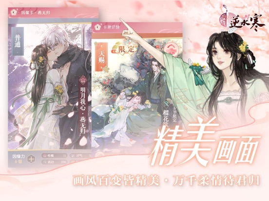 【游戏介绍】 《遇见逆水寒》——网易首款唯美古风恋爱手游 一场命中注定的相逢,梦回北宋,遇见逆水寒!穿越时空,沉醉江湖,你,一位来自现代的旅人,在《逆水寒》如诗如画的游戏世界中行侠游历,缔结因缘! 无情、顾惜朝、李师师、叶雪青,诸多《逆水寒》人物悉数登场,与你相伴,共游江湖。深入跌宕的唯美剧情、难舍难分的情缘羁绊、重重闯关、因缘收集,诸多玩法更与《逆水寒》端游深度联动! 所有江湖偶遇,都是宿命相逢。遇见逆水寒,遇见你的专属因缘! 【游戏特色】 一、极致唯美:探索未知浪漫,追寻心动脚步 寻梦江湖,遇见逆水寒! 开启美妙机遇,浪漫旅程没有终点,知己红颜,沉醉江湖! 所有的江湖偶遇都是宿命的重逢,打开全新江湖故事,穿越重重因缘浪漫邂逅《逆水寒》。 《逆水寒》的世界,会呼吸的江湖。行程万里,遍游天下,种种奇特风景,各式江湖奇物俯拾即是。 更有诸位《逆水寒》人物宠爱相随,共知旅程冷暖。浪漫江湖奇遇等你发掘。 二、动人剧情:逆水寒端游班底执笔打造 端游《逆水寒》满分剧情再出江湖,带来最动人的故事,最具柔情的江湖! 触碰画卷,梦回北宋绝美江湖,命中注定的相逢,穿越时空阻绝,遇见《逆水寒》! 夏有凉风,秋有明月,千年画卷,由你描绘。一世之盟,生死之约,宿世因缘,等你书写。 无情、顾惜朝、叶问舟、方应看、燕无归、叶雪青、李师师、花将离、温柔、姬蜜儿,十位《逆水寒》人气角色悉数登场,与你相伴而行。 三、双端连通:以爱穿梭两重世界 江湖冷暖,唯爱永恒。 在《逆水寒》如诗如画的游戏世界中行侠游历,策马天涯! 结识端游逆水寒玩家,探索大宋风景。绘制江湖奇景,定格行程最美时刻,百分之百绝对还原《逆水寒》华丽场景,珍藏每一份江湖游历记忆!多种方式与人气端游《逆水寒》进行深度联动。 全新互动方式,奇妙双重世界,相遇相逢,相知相伴。 更多朋友,等你遇见! 四、双性别恋爱:宠爱不止一种形态 甜蜜女线故事,触摸古画,解锁宿世因缘。命中注定的相会,遇见生死相随之人。江湖虽大,有他相伴,便再不孤单。执子之手,与子同行。 深情男线故事,解锁身世秘密,探索未知神秘力量,更有机会与众多豪侠交游,花丛醉饮,独得芳心。 种种江湖奇缘,等你体验。 五、五倍甜蜜:五条专属语音感情线 五位性格迥异的角色,五种不约而同的关怀。走心的江湖故事,顶级的CV加持,一言一笑都逼真动人,带来更有沉浸感的浓情体验。 茶楼夜话,把盏长谈,探寻各位角色心底的秘密,提升人物好感,解锁专属剧情。种种江湖过往,心底旧事,只讲给你听。 【联系我们】 如果您喜欢我们的游戏,欢迎您随时给我们评价、留言。 官方网站:https://yujian.163.com/ 官方微信:yjnsh520 官方微博:@遇见逆水寒 客服电话:951635271.熙日漫戏 时至金秋,正是与心上人一起出门秋游的好光景~快来参加熙日漫戏活动,与心上人组队一起赢得比赛吧! 2.限时概率提升,重雪怀梦 活动期间,活动卡池可自由选择心仪的角色进行结缘!同时角色因缘卡限时概率提升,更有全新限定天赐卡牌推出!桃花笺卡池每次抽卡概率获得“笺彩”,每十连抽至少可以获得5个“笺彩”,“笺彩”可在天赐碎片商城兑换桃花笺卡池概率提升的天赐卡牌碎片,卡池时间结束后每个未使用的笺彩会被回收为1个因缘签。