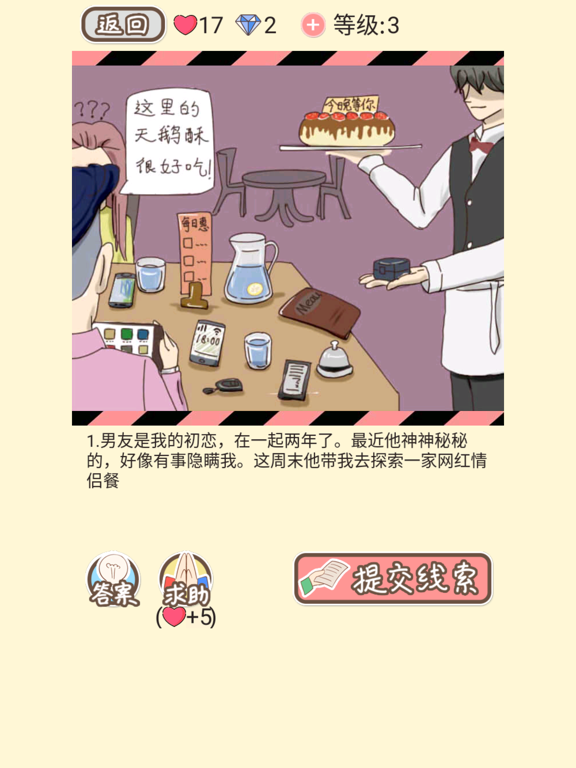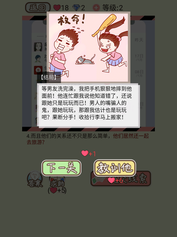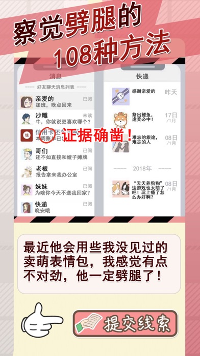 《情侣的秘密》是一款讲述现实生活中情侣之间一些不可告人的秘密。花花绿绿的世界对于每一对情侣来说都是充满诱惑的(暧昧、小三、御姐、小奶狗...)各式各样的情景。老实说一对情侣能够安安稳稳的生活到老真心不容易...... 本游戏主要通过阅读剧情从中获得线索,从图中找出花心男女出轨的证据。几十种不同的出轨情境,几百条令你意想不到的线索,场面十分劲爆,你敢劈腿,决不饶恕。 如遇到“三不男”,女人也应拿出自己的“三不原则” PS:来体验一下当福尔摩斯的感觉吧! 游戏特点: 1.阅读剧情的线索展示,可能存在的N种出轨问题等你来“消灭”; 2.图文结合的游戏模式,不一样的解谜; 3.不同的情侣在外逛街时乳胶是漆,然而都隐藏着不为人知的另一面; 4.校园情侣更是玩法新奇,让人大开眼界; 5.更多精彩持续更新中......优化了部分关卡答案提示