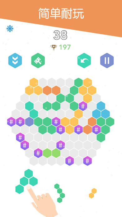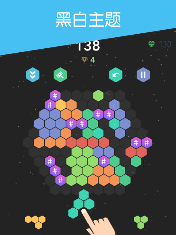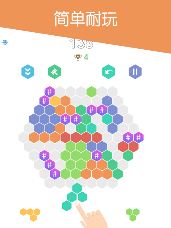 六角消除-Hex六边形消灭游戏2018版,是一款简洁耐玩的六边形方块消除单机游戏,画面清新风趣,玩法简单益智,更有世界排行任您竞技,绝对值得您喜爱。 只需将底部的六边形组合拖放到六边形矩阵中,在三个方向连成直线即可消除直线中的方块,候选方块无法拖到屏幕中央时游戏结束。没有时间限制,无需颜色搭配!用匹配的六边形组合任意匹配,尽情享受根本停不下来系列作吧! 发挥您的才智,摸索高效的走法,还等什么呢,赶快下载体验吧! PS:密集恐惧症的可能会有不适应,不过说不定也会消除它呢!(。・ω・)ノ゛1、添加进入最高得分显示 2、优化游戏体验和稳定性