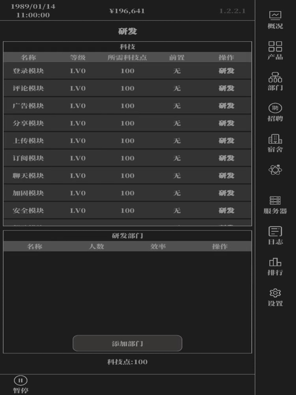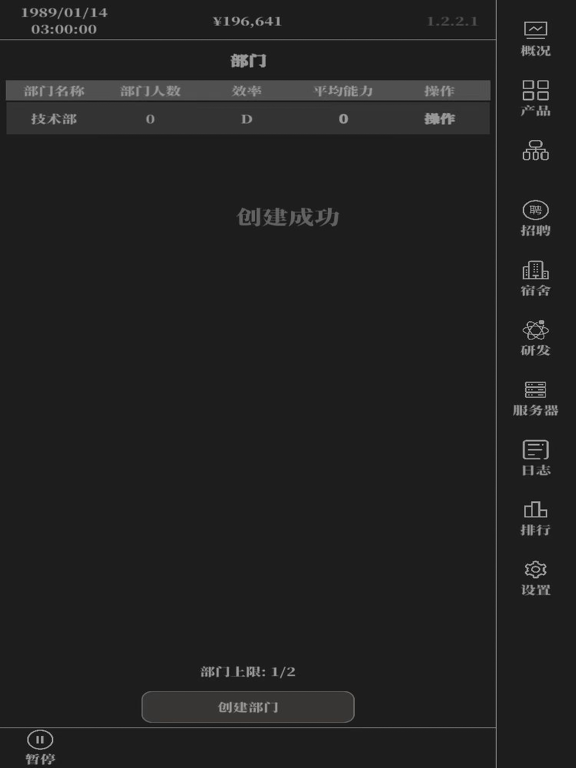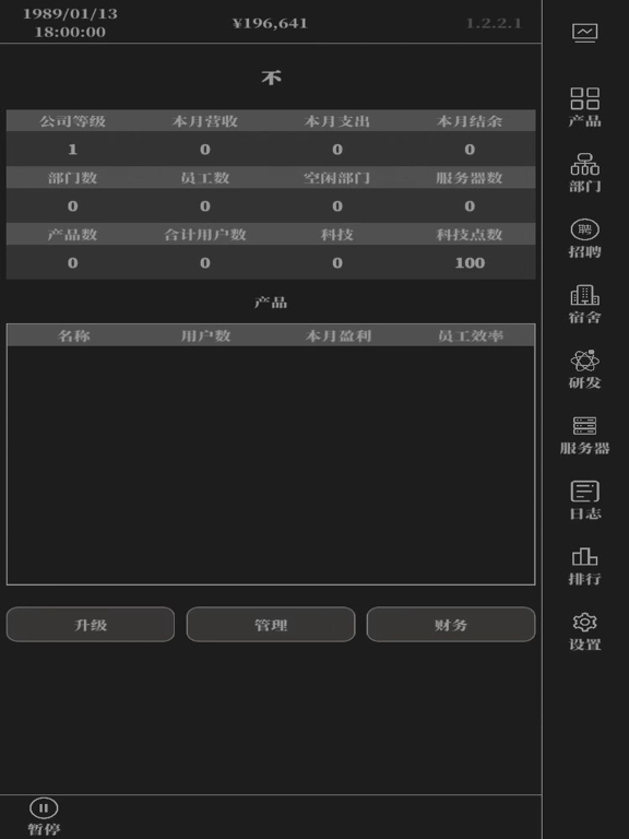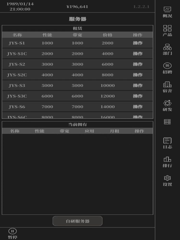 模拟经营一家IT公司 招聘好员工 培养好员工 对资本的取舍,难度略高增加一键生产当前最高集成等级服务器 修复排行榜无法更新数据 修复服务器集成错误 调整界面UI 修复服务器研发负数 增加自研1万次 优化猎头招聘数量 开放公司等级300 新增单部门一键辞退 新增投资-会客室 新增猎头招聘不清空列表 增加自动拒绝潜力抗压 修复自动拒绝BUG 新增招聘筛选功能 降低疲劳度上涨速度 香皂增加部门外一键培养功能 增加研发批量添加部门 修复科研闪退 优化广告员工上限