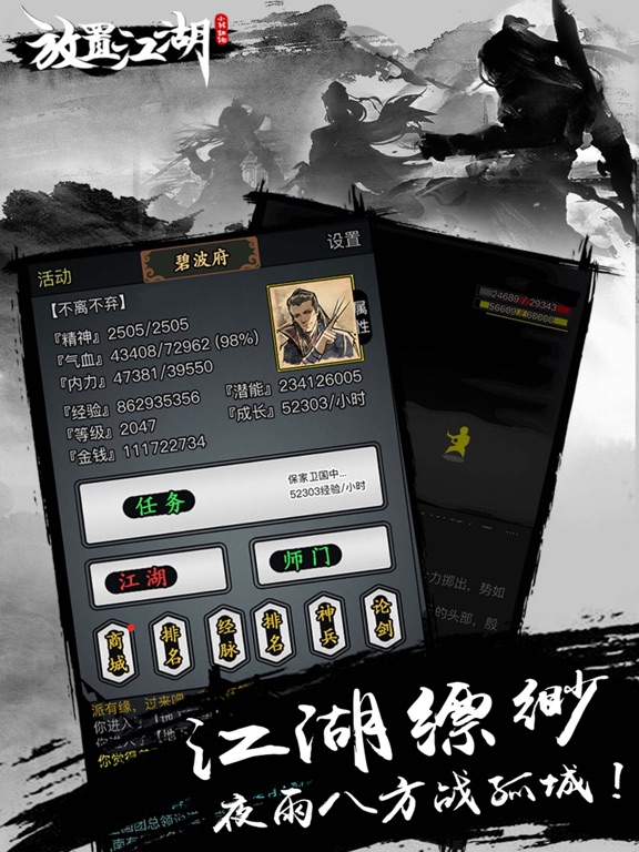 《放置江湖》是一款武侠风格高自由度的角色扮演,冒险游戏。 江湖五载,风起云涌。重光入侵,烽火连天,武林动荡,血雨腥风! 《放置江湖》七周年之际,江湖中有一股神秘组织力量名为重光教的教派,他们一边不断地发展壮大,一边开始威胁到中原的各大门派,以让重光教一统江湖,江湖中人人自危。武林动荡时局已定,我等特邀诸位侠士齐聚江湖,联手抗敌! 侠之大者,为国为民,群英荟萃,歃血为盟...... 新资料片“重光入侵”强势来袭! =====七周年版本更新内容===== (以下为整个暑期7月-8月版本更新内容,具体更新日期依据游戏内公告为准) 【全新剧情】 ※更新《重光入侵》全新剧情、支线剧情和日常任务。 【新版战斗及多人战斗】 ※新增多人对多人的战斗,战场上同时存在多个目标。 ※新增多目标武学招式,可同时影响多个目标。 ※新增防御反击,某些武学可以通过反击打断对方当前攻击招式。 ※调整核心战斗机制,伤害机制更趋向平衡。 ※调整轻功及招架战斗机制。 ※修复部分战斗BUG。 【江湖笔录】 ※新增江湖笔录系统,根据笔录内容会逐步引导学习与探索整个放置江湖的玩法。 【先贤书案】 ※新增先贤书案,玩家在传承前可以透过先贤书案,把自身学会的武学记录,便于后人在传承后付出一定条件进行学习。 (书案记录是终身记录,不需要多次重复记录。) 【烂柯棋局】 ※新增烂柯棋局玩法,玩家可以透过此棋局提前体验新版战斗里面的全新内容,并且使用指定门派提前体验突破后的武学形态。 (烂柯棋局中玩家也可以获得梦境呓语。) 【五周年称号】 ※玩家可以通过五周年彩蛋任务,进入彩蛋副本处获得五周年纪念称号。 【神兵优化】 ※玩家可以锻造并容纳更多神兵。 【江湖情报】 ※新增关于周年庆内容相关的江湖情报和小技巧。 【面具升级】 ※新增升级面具,玩家可以对部分指定面具进行升级,升级后的面具会变得更加华丽。 (李魔头面具重绘更新上线。) 【其他优化及更新内容】 ※新增平安小镇日常任务。 ※优化界面切换卡顿问题。 ※优化书箱卡顿问题。 评价: ——“前期功能看似很少,可随着一步一步了解游戏,解锁功能后才发现,这个游戏太丰富、大庞大了!!” ——“不是简单的放置类游戏,也不是无脑卡牌游戏,这样的武侠太少了,光凭这两点就值得一试。” ——“我坚持玩了5分钟,然后几个小时就过去了。” ——“游戏内战斗的对白和招式挺有意思的,很有武侠小说的感觉。” ——“看腻了各种仙侠,修真,真的有点审美疲劳,还是这种纯武侠味的更真实更有血性。” =====游戏特色===== * 依凭文字游走江湖。细心探索NPC对话,发掘隐藏任务,揭秘NPC小秘密,江湖的故事绝不止一点。 * 28个门派任君选择,更有一些隐藏门派等你发现。 * 几百种武功应有尽有。镇派绝学、江湖武学,更有绝世神功等待有缘人。 * 海量地图,构造一个庞大的江湖,行走江湖无止境。 * 简化基础成长,离线也能练功。想快人一步?没问题,有更丰富的事件等你解决。 * 打造属于自己的专属兵器。起一个帅气的名字,让它和你一起名扬天下。 * 江湖会因为你的行为而产生改变。如果你杀死了NPC,那可要小心NPC的后代复仇噢。 * 江湖之大,穷尽一生也走不完。当岁月催人时,你可以选择退隐江湖,而以自己的后人的身份继续游戏,而江湖上到处都是过去你的传说。 * 开启家园,在江湖中建一间大宅,有一方偏安江湖之隅。招募门客、怪客拜访,多种玩法,等你前来。 * 自创武学,成就一代宗师,问名江湖天下无敌。 * 梦境,光怪陆离,一梦犹如人生百年,体验不一样的江湖。 =====历史更新===== 【家园系统】 *新购屋宅,在江湖中种田耕农、招募门客,何不快哉。 【跨服副本】 *和来自不同江湖的人士比武论剑,到底谁才是真正的天下第一。 【新章节剧情】 *铁掌海鲸摩擦不断,各派人士蠢蠢欲动,朝廷江湖牵扯不断,到底谁才是搅弄武林的真正黑手?只要顺藤摸瓜,江湖隐秘必将大白天下。 【师门地图】 *各门各派都拥有了属于自己的地盘,同门切磋、挑战师父,全新师门任务等你开启。 【科举考试】 *从乡试、省试、殿试一步步成长,一展才华,金榜题名。 【制作组】 *挑战游戏制作组的机会来了!全新地图,全新任务,彩蛋等你发现。 【自创武学】 *自创属于自己的专属武学,开创属于自己的打法流派。 【梦境】 *一门与梦相关的武功。种种谜团,纷繁往事,皆等少侠在梦境之中。 ======联系我们====== 《放置江湖》微信公众号:放置江湖 《放置江湖》官方QQ:800184002 《放置江湖》官方邮箱:service@mkjump.com 《放置江湖》官方网站:http://fzjh.xiaohoutiaotiao.com 《放置江湖》攻略资料站:https://wiki.biligame.com/fzjh/ 《放置江湖》玩家交流QQ群:821429732增加游戏首次启动时的网络授权检查 优化底层热更新逻辑