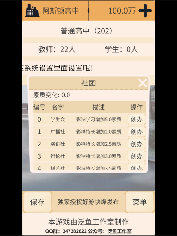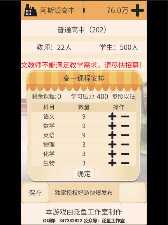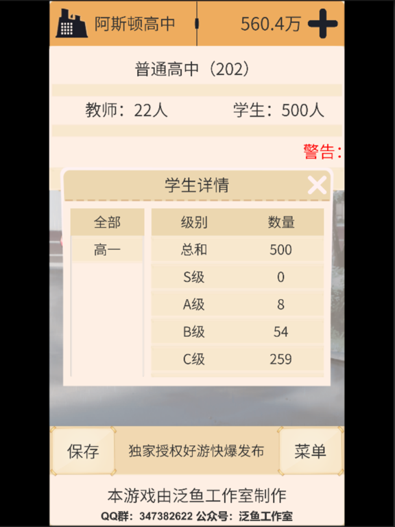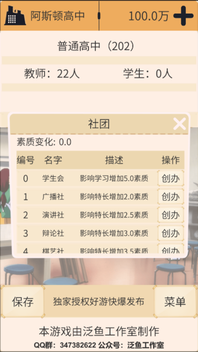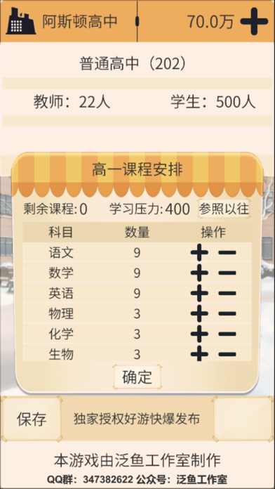 模拟学校经营,你来当校长,怎么排课,放不放假,都由你说了算,经营过程中遇到的各种突发事件该如何处理,每年的高考该如何准备,这都将是你的考验,你的目标就是将你的学校发展成世界一流名校。 官方QQ群:756614623 微信公众号:泛鱼工作室修改已知bug 修复广告显示问题