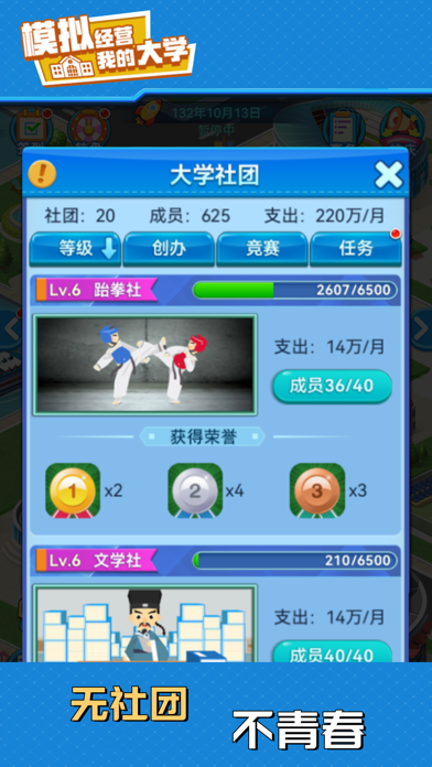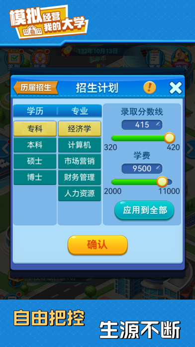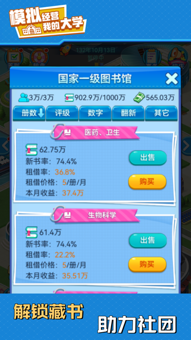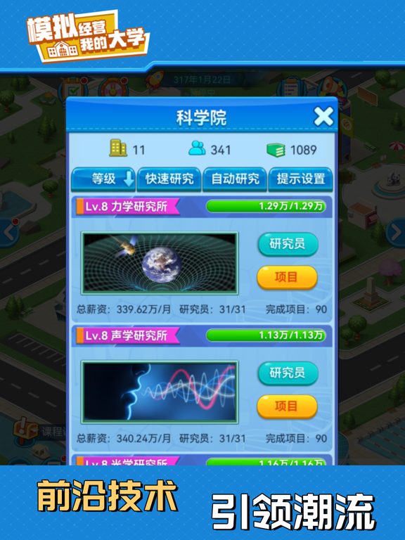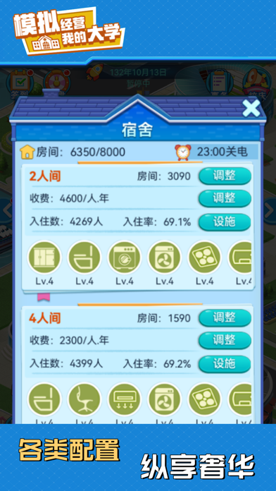 欢迎来到《我的大学》!这是一款充满趣味与挑战的模拟经营类游戏。在这里,您将化身校长,主宰校园命运,制定战略方针,规划未来蓝图,投身校园建设、师资招募、课题钻研、学生培育以及突发应对。以智慧和决策,引领学校迈向世界一流! 游戏操作简单,可随拿随放,非常适合打发无聊时间,快来与众校长同台竞技,体验前所未有的经营乐趣吧! 【游戏特色】 1、 餐厅:招募厨师,研发菜品、培育厨神,用美食留住学子心。 2、 宿舍:配备多元炫酷设备,打造超燃高科技宿舍。 3、 社团:奇思妙想的社团任务,热血沸腾的竞技比赛,铸就青春别样精彩。 4、 体育中心:挖掘体育精英,组建顶尖战队,角逐奥运赛场,斩获世界殊荣。 5、 实验楼:解锁神秘课题,打开未知领域,承接市场项目,勇攀学术高峰。 6、科学院:谁能更快掌握前沿科技,谁就能主宰世界。 7、图书馆:参与国家评级,开拓数字资源,珍藏稀有典籍,彰显学校底蕴。 8、招生:自由把控录取分数线与学费,钞票还不手到擒来~ 9、专业开设:从基础实用到多元拓展,实现人才培养高质量发展。 10、高校建设:从专科到本科,从211到985,在不断进阶中实现综合实力的跨越。 11、公共建设:网吧、奶茶店、剧本杀店等应有尽有,致我们终将逝去的青春! 12、随机事件:惊心动魄的随机事件,让游戏永远充满着不确定性和新鲜感。 13、投资:是馅饼还是陷阱?是机遇还是风险?等你来揭晓~ 14、校企合作:培育顶尖人才,推动校企合作,为学校发展助力。 15、学校活动:丰富多彩的大学活动,解锁学校新篇章。 16、校庆:这不仅是一次校庆,更是一次重温青春、寻找初心的奇妙之旅哦~ 【欢迎加入官方qq群】 5群号:850740692 6群号:1834363581、优化内存占用; 2、优化科研花钻石界面相关描述; 3、教师管理界面新增数据:培训中和承接中,方便查看有哪些教师正在实验室承接项目; 4、修复没有外联社,但是前期出现外联社差评; 5、增加校管名录,入口在任意教师设置界面,方便管理教师职位; 6、优化人事团队预算显示,减少理解障碍; 7、新增实验室导师名录,方便查看有哪些教师正在承接项目; 8、优化投资,新增投资买入卖出点记录(最大保留5年),新增最低最高实时价格显示,新增项目单价显示;