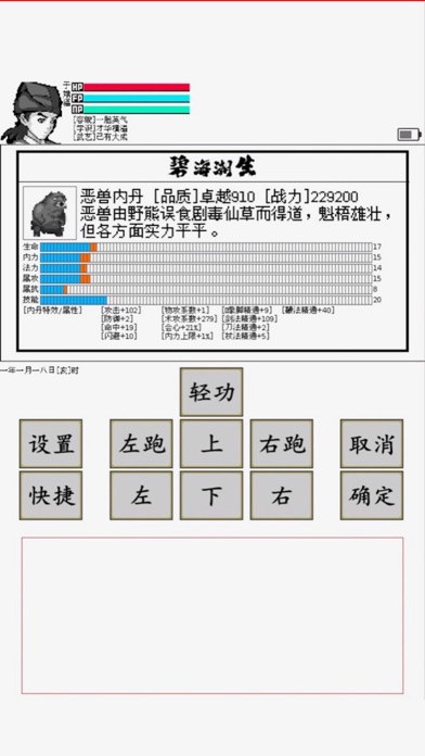 【简介】《碧海潮生怀旧版》是一款高自由度武侠题材的文字冒险游戏;灵感来源于曾风靡一时的电子辞典游戏《黄金英雄坛说》。玩家扮演从时空裂缝中穿梭到武侠世界的14岁布衣少年,为揭开身世谜团,怀揣理想却异常散漫的闯荡着江湖。碧海潮生怀旧版扩宽了世界观,引入了仙,魔,佛新身份;丰富了武学,门派,流派;简言之,呈现了一个更为广袤神秘的世界给玩家。坛说系列之所以能在玩家心中占有一席之地,归功于高自由度带来的散漫感与舒适感,碧海潮生怀旧版秉承了此风格,并没有赋予玩家特定的主线任务,一切因果故事皆可由玩家自己创造自己承受。友情提示:千万不要试图激怒NPC,否则可能导致灭门之灾! 【革新】碧海潮生怀旧版在重制时做了许多更新与优化:地图,物品,技能,UI界面均进行了大幅美化,人物建模与交互更加逼真;战斗系统采用了回合制与策略要素结合的新颖战斗方式,阵型,绝招,乃至地形都可对战斗结果造成影响;培育系统升级,可培养门下弟子各项属性,甚至能带着他们做农活;网络对战升级,与其他玩家PK可获取丰厚的奖励,此外,世界BOSS掉落物品也十分丰厚哦!自制剧情系统升级,支持更便捷的录入,赶紧与其他玩家分享你心中最热血最感人的武侠故事吧! 还有更多的细节需要玩家满满体会,开发团队也会一直聆听玩家建议,不断改进,力争打磨出最好玩的坛说系列游戏。 官方客服邮箱:xxts@cdmbkkjwwgc.onexmail.com 技术支持QQ:525325356 官方Q群:374497650 欢迎加入,坛说有你更精彩!1.新增各种战功武器的造型;新增3个角色造型; 2.降低吐蕃桑布扎扳手腕提升先天臂力的小游戏难度; 2.新增饰品戒指护符的打造;修复绝招禁用无效的BUG; 3.修复吐蕃贩卖任务,修复瑶池天灯和后台恢复卡死等已知BUG。