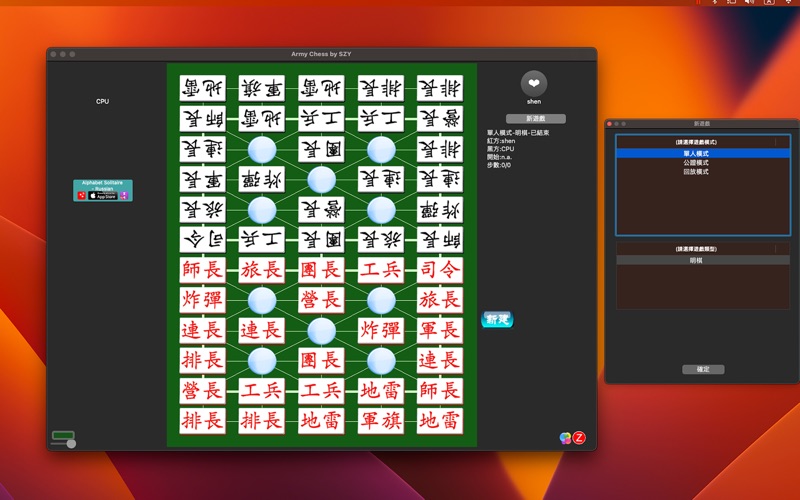 简介 军棋是一款在中国家喻户晓的,模拟战争的双人棋类游戏。 游戏模式 单人模式;人机对战 (New!) 公证模式:充当公证人的功能 回放模式:回放历史游戏的功能 游戏类型 明棋:棋子大小互见 特点介绍 全面支持4种语言:中文,英文,日语和繁体中文。 (Known bug fixed & Happy 2026!) 改进了游戏功能和用户界面外观