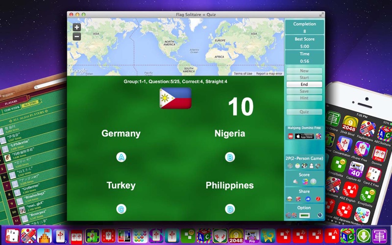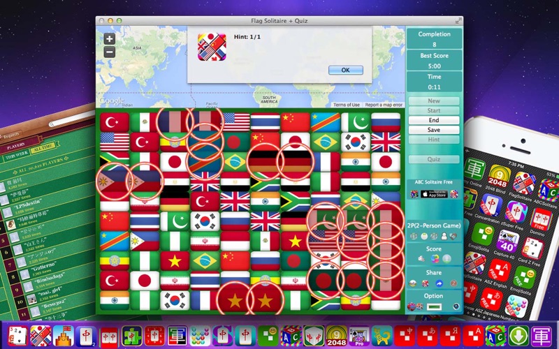 http://www.youtube.com/watch?v=w7Tmu29rbic (概述) 你有两种方式来玩此游戏:玩通关游戏或者回答小测验。但是两者不是孤立的, 你玩通关玩得越多, 你会在小测验中回答得更好。, (国家/地区的数量) 游戏共有175个国家/地区,按人口多少分为七组,每组25个国家/地区。 (玩通关) 玩通关游戏需要你的观察力和耐心。你要每次消除两面相同的旗帜, 直到所有的旗帜被消除。如果两面旗帜水平或垂直排列, 并且之间没有其他旗帜, 那么它们就可消除。为使旗帜可消除, 你可以最多移动一次旗帜。你的任务是找出潜在的可消除的旗帜。这是考验你的观察力和耐心的地方。你只有一次寻求提示的机会。, (回答小测验) 你要在90秒内回答25题。问题将从第1组到你刚玩过的一组中随机挑选。第1组的问题是最容易的, 每个正确答案得一分。组号越高, 得分越高。问题形式有两种类型:给你旗帜, 你回答其国家/地区名称;或者相反。连续正确的回答将得到高分。, (国家/地区的概况) 当你点击一面旗帜时, 你会被告知以下信息:国家/地区名称, 洲, 首都, 人口, 人均GDP, 和其在世界地图上的位置。因此, 通过玩这个游戏, 你将不仅成为一个旗帜通, 而且你会知道很多关于每个国家/地区的详细信息。你甚至可以利用此游戏来学外语。, (分数) 三种类型的分数将报告给Game Center的排行榜。他们是最好时间,完成次数,测验分数。此外,成就榜设置了五个级别。 (选项) 1。语言:总共支持12种语言。菜单语言将自动从你设备设置中选择。国家/地区概况的语言可以从选项中手动选择。 2。颜色:你可以从三种不同颜色中选择你喜欢的背景颜色。 (相关游戏) 虽然中元麻将(通通通通)和ABC Solitaire都是非常具有挑战性和娱乐性的游戏,Flag Solitaire将使你在娱乐中学到一手! (serious bug fixed) 改进了游戏功能和用户界面外观