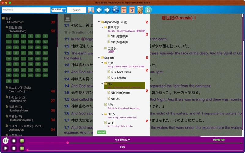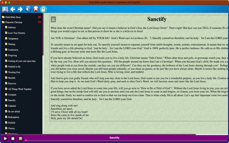 日语和英语对照版本圣经,并配有真人语音朗读。 本应用有以下特点: 1. 离线阅读日语和英语圣经 2. 在日语圣经中搜索关键字 3 在英语圣经中搜索关键字 4 选中圣经语句并拷贝分享到其他地方 5 非常容易的在圣经目录中选择书籍和章节 6 日语和英语圣经语音支持在线和下载后离线播放 iOS版本地址是: https://itunes.apple.com/us/app/sheng-shu-ri-ben/id687178483 Add furigana for kanji in 口語訳