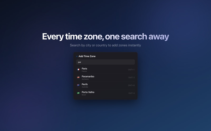 在菜单栏随时掌握世界时间。ZoneClock 将你关心的时钟以国家旗帜形式展示,始终一键可见。 一目了然的时区信息 添加世界上任意城市,即刻查看其当前时间。每个时区都会显示国旗、城市名称和 UTC 偏移,让你随时了解时差。 原生菜单栏集成 可选择在菜单栏中直接显示带有旗帜图标和实时时间的时钟。只需一个开关即可在菜单栏中开启或关闭任意时区。 主要功能 * 通过搜索城市或国家添加任何 IANA 时区 * 国旗图标,快速视觉识别 * 在菜单栏中开关时钟显示 * 切换 12 小时 / 24 小时制 * 拖动重新排序你的时区列表 * 轻量且快速,极少资源占用 适用场景 * 分布在不同时间带的远程团队 * 经常出差但想关注家乡时间的旅行者 * 需要安排跨国通话的人员 * 数字游民与国际自由职业者 简洁至上 无需账号、无需订阅、无多余功能。ZoneClock 专注于一件事,并把它做到极致。它可随登录启动,静静驻留在菜单栏,随时为你提供所需时间信息。 EULA: https://www.apple.com/legal/internet-services/itunes/dev/stdeula/