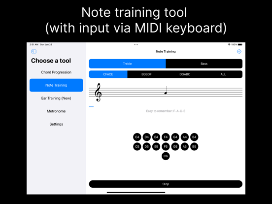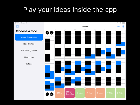 这款应用加上您的耳朵,等于在音乐创作中的完全自由! 一套全面的音乐工具,适用于任何音乐人: Chord Progression: 自由创建美妙的和弦进行——使用转位、sus2、sus4、七和弦、九和弦等。可实时播放钢琴或合成器音色,或直接将 MIDI 发送到您的 macOS 电脑! MIDI Keyboard: 将您的手机变成 macOS 电脑的 MIDI 键盘(兼容 macOS Catalina 及更新版本)。 Notation Practice: 练习识别高音谱和低音谱上的音符。 Chord Calculation: 帮助您学习如何计算和弦及和弦进行。 Interval Practice: 通过听觉练习识别和比较音程。 Voice & Ear Training: 简单有效的工具,助您进行发声练习和听觉训练。 此外,您的购买还包括 macOS 版本! 感谢您使用我们的应用!本次更新内容: - MIDI 播放模式下新增了力度滑块!