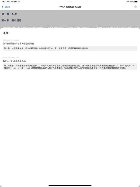 【模糊全文搜索】一键搜索全部法律内容 【法条批注】单击法条即可新建批注,方便回顾 【收藏】收藏您常用的法律文件 【功能定制】我们可以满足您的功能定制需求,给您极致的使用体验 收录全国现行有效或者失效的法律,旨在成为学生、律师等朋友在需要查询法条时最得力的助手。 纯净无广告 如果您有任何建议,请您及时与我们联系,我们将会综合考虑,尽可能满足您的使用需求。 调整一些细节 优化业务逻辑
