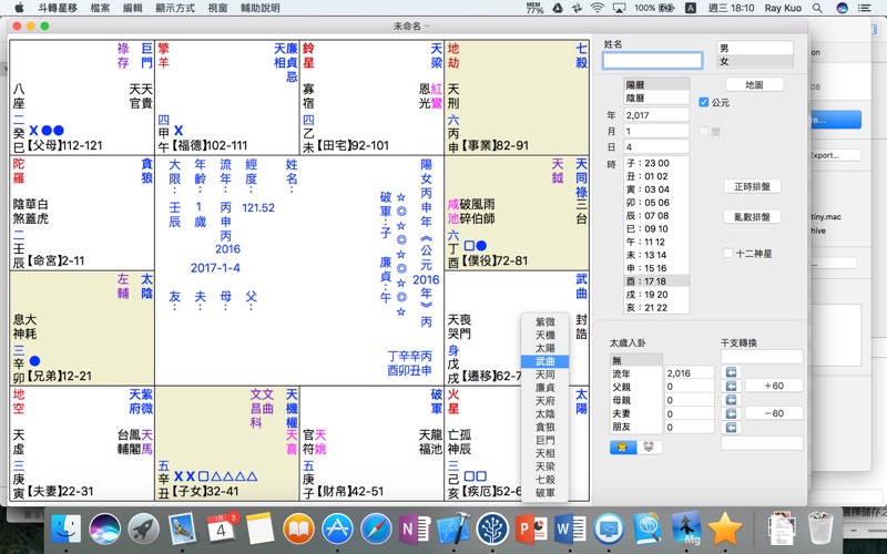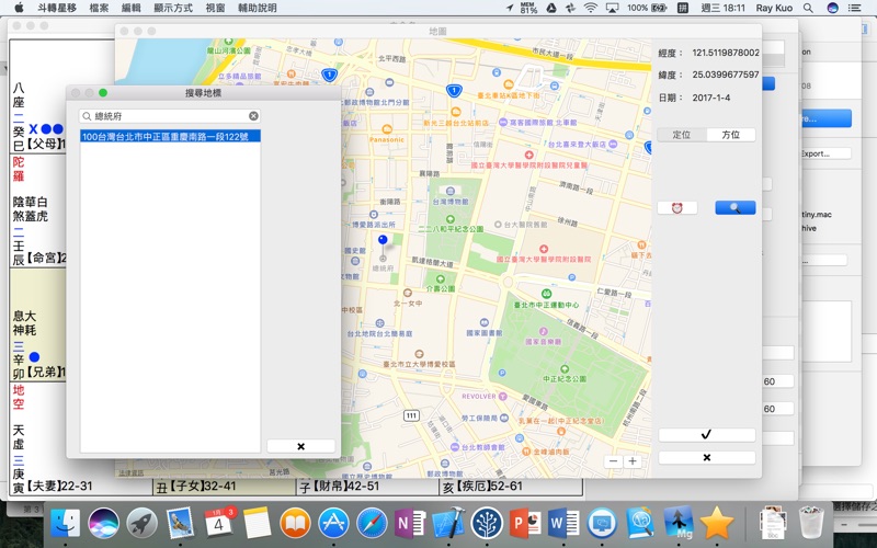 斗轉星移是iOS/macOS 紫微斗數排盤軟體,可以在任意十二地支上變換十四主星,太微賦: 「 帝居動, 則列宿奔馳。」;斗轉星移可以依據星曜取用,產生對應的變盤。 感謝恩師黃建霖老師不厭其煩的指導,提供建議-斗轉星移得以順利開發完成上架。 斗數曆: 1)斗轉星移斗數曆年份支援區間是 「陽曆 公元1203/1/1 - 3097/12/31」 。 2)斗轉星移可以造出任意地點的斗數曆,斗數曆依據「子初換日」。 3)斗轉星移可以依據任意地點的日出日落日正當中,查詢任意地點的時辰劃分。(編輯=》時辰確認) 操作方法: 1)在12地支點擊滑鼠左鍵,可以變換14主星。 2)在12地支點擊滑鼠右鍵,可以變換五虎遁或是五鼠遁。 3)在命盤中間點擊滑鼠左鍵,可以切換[ 變盤] [原盤],或是「複製命盤」 4)在命盤中間點擊滑鼠右鍵,可以切換別觀法。 5)使用Control+C,將命盤複製,貼到(Command+V)其他文書編輯軟體上(如Keynote, Page, Word, PowerPoint) 方位量測功能: 結合蘋果地圖,斗轉星移可以設定兩地的大頭針,量測方位。 命盤定位功能: 結合蘋果地圖,斗轉星移可以輕易設定命盤出生地。 時辰確認功能: 結合蘋果地圖,斗轉星移可以計算出任意地點日出日落日正當中,求當日真正時辰劃分。 太歲入卦功能: 1)太歲入卦有流年 父親 母親 夫妻 朋友可以入卦。 2)提供干支轉換太歲功能。 3) 太歲入卦可以選擇五鼠遁或是五虎遁。 命盤檔案管理: 1)命盤檔案以PNG圖檔形式存在,任意看圖軟體都可以讀取命盤。 2) iOS macOS 斗轉星移命盤檔案互相相容。 日曆功能: 提供斗數日曆,方便快速擇日。 想進階了解斗數/斗轉星移,歡迎報名參加黃建霖老師的【 斗數卦理讀書會】 http://blog.xuite.net/eric.destiny/blog/318068026 修正在macOS Sonoma 下,命盤顯示不正常的問題