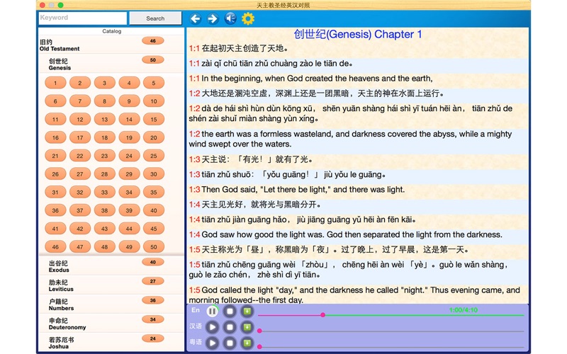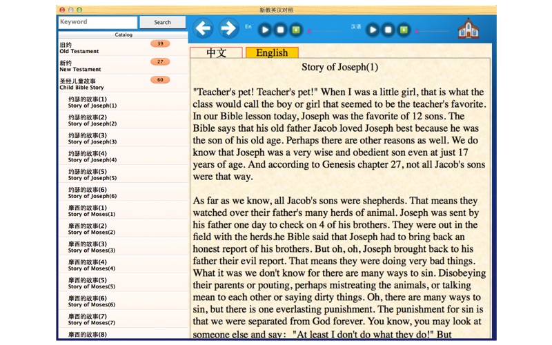 圣经是创造宇宙和人的上帝赐给全人类的信息,分旧约和新约,新教共有六十六卷,天主教共有七十三卷。 本软件是中英对照版本。 本软件同时提供英文和中文有声语音圣经。 软件可以下载圣经语音到电脑功能,在您没有网络的时候也可以收听语音圣经。 经文部分可以离线免费浏览,语音部分需要付费播放。 the iOS protestant version app address is: https://itunes.apple.com/app/id584678615 the iOS catholic version app link is: https://itunes.apple.com/app/id882413842 1. Add Indonesian bible; 2. Fix some minor bugs.