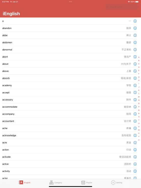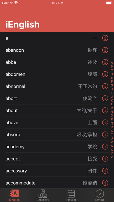 【新】完美支持 iOS 、 iPadOS 、 macOS English 是一款英语初学者提供基础英文单词学习的应用,正确的单词发音、必备的分类单词,不断努力打造更简单更好方式呈现更有趣的英语知识,让大家在零碎时间也可以快速和简单的学习get! - 3500入门单词 - 全局单词搜索 - 准确的英文发音 - 常用单词分类汇总 - 单词列表自动播放 这是英语初学者必备的单词学习的好工具,强烈推荐英文初学者的工具!希望它能成为你英语学习的快速阶梯! #快捷键# - command + 1/2/3:切换 TabBar 标签栏 - command + Escape:返回(如果是子页面,返回上一页面) 【提示】 本App只需要在一个平台付费后,其它平台将免费获得。例如,你在 iOS 下载本应用后,在 iPadOS 或 macOS 可能会显示付费下载按钮,此时并不需要再次付费,点击下载后,会提示将免费获得,请放心~ 【注】 - 注:如果中文朗读无声音,请检查选择的声音是否有效。(设置 -> 辅助功能 -> 朗读内容 -> 声音 -> 中文) - 承诺应用内永远不会显示广告弹窗,保证您学习过程中,专注和优秀体验! - 您在使用过程中,有任何疑问或建议,欢迎评论和反馈!感谢支持!感谢! - 本软件现已开源,详细访问:https://github.com/iHTCboy/iEnglish 如有疑问,欢迎留言反馈~ - 新增“英文助读”,粘贴文字转声音 - 播放单词列表时,保持屏幕常亮 - 优化应用细节体验 最近更新: - 可以自由创建背诵单词数,英文和中文同时播,支持后台播放,提高单词记忆的效率