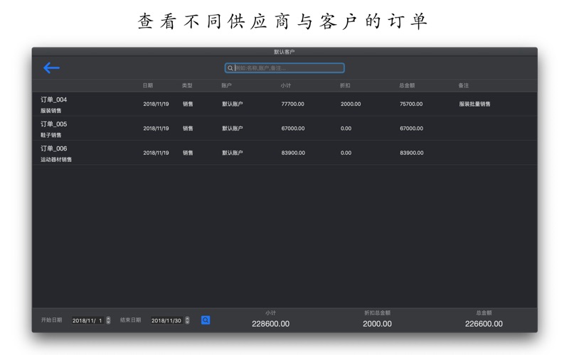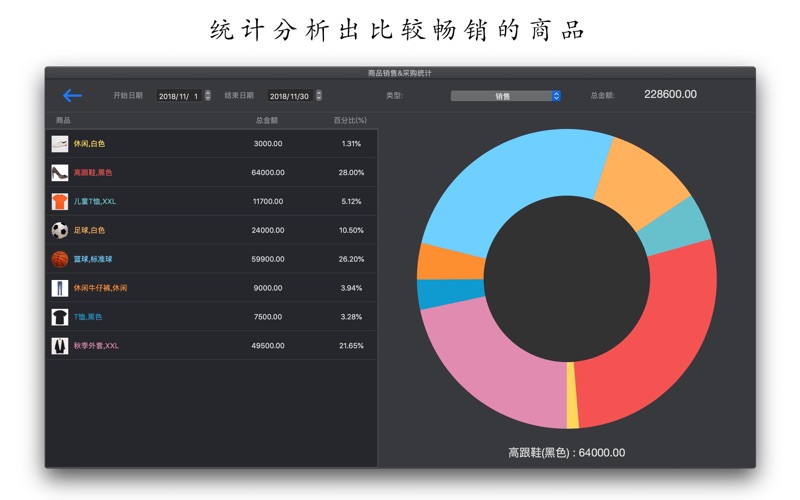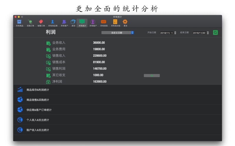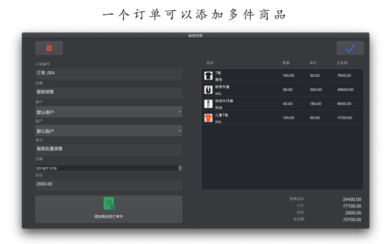 DailySalesPro(进销存库存管理)是一款易于使用的进出货库存管理和业务记账工具,让您及时了解库存状况、销售收入、采购与销售成本、销售利润,以提升资金使用效率,使您能快速应对市场变化。 适用于批发商,零售商、微商代购、店家,卖场等产品进出货买卖人。 主要功能: - iCloud同步与备份功能,可以在其他设备共享数据。 - 将您的产品库存,生成PDF报告导出。 - 1个订单可以添加多件商品,并累计总金额、销售成本。 - 库存预警,保持库存安全。 - 您可以设置产品最高的库存与最低的库存。 - 自定义商品父类别(添加、编辑、修改)。 - 自定义商品子类别(包括分类、名称、规格、计量单位、商品编号、备注、日期、采购价格、销售价格、库存预警、最大库存、图片等属性)。 - 商品子类别与商品父类别关联,可以快速查找到不同分类的商品。 - 商品编号格式可以根据您的需要定制。 - 自定义供应商(添加、编辑、修改)。 - 自定义客户(添加、编辑、修改)。 - 随时查看供应商 & 客户关联的所有订单,可以通过两个日期过滤订单记录,并做出相应的小计、折扣、总金额等统计。 - 业务收入与业务支出管理。 - 自定义收入类别与支出类别(添加、编辑、修改)。 - 自定义资金账户,自动统计每个账户的总收入、总支出、总余额。 - 随时查看每个账户关联的交易历史记录,可以选择两个日期范围内的交易数据导出。 - 采购与销售订单管理(添加、编辑、修改)。 - 添加订单时,如果商品库存数量低于库存预警,系统将会提醒您。 - 采购与销售订单对应多件商品,每个订单可以一次性添加多件商品,订单中的商品可以修改或从订单中删除。 - 每个订单可以添加折扣金额,也可以添加备注。 - 每个订单可以添加标题与订单编号,订单编号格式可以根据您的需要定制。 - 统计包括: 利润统计、业务收入、业务支出、销售收入、销售成本、销售利润、净利润、产品库存、销售总金额、采购总金额、折扣总金额等。 - 支持手动记账与自动记账功能!自动记账很实用,不需要记录收入与支出条目,节省您的时间。 - 支持条件搜索,快速搜寻商品、订单、 账户、规格、类别、交易记录,供应商,客户等。 - 可以按日期(全部、今天、本周、本月、本年、自定义日期)查看所有项目的历史记录。 - 可以按日期(全部,自定义日期)导出不同项目的CSV数据。 - 密码保护个人数据(可以添加、修改、验证)。 - 系统预先设定的商品,分类,规格,单位,账户与付款成员可供快速选取使用。 - 允许输入的金额保留后两位小数点(例如: 19.99, 188.88)。 - 自定义商品编号格式(例如: ABC_001, Product001)。 - 自定义订单号格式(例如: ABC20181013001, Order_20181013_001)。 支持鼠标右键菜单点击排序: 按名称降序与升序 按日期降序与升序 按金额降序与升序 订单页面根据自定义日期排序 多种统计 1, 销售 & 采购的统计 2, 供应商 & 客户的订单统计 3, 类别的收入 & 支出统计 4, 账户的收入 & 支出统计 5, 商品库存 & 利润的统计 6, 账户销售&采购统计 如果您对使用上有任何的问题,可以通过App中的电子邮件联系我们,我们一定会更好的服务您。 Bugfixs