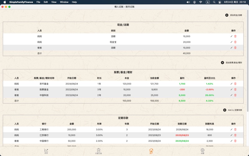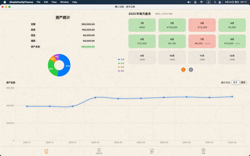 - 以卡片方式按月记录分类收支情况(不支持记录详细支出!) - 每月的记账卡片填写完毕后可以分享给“领导” - 对家庭资产进行跟踪:现金、投资、定期、借款 - 按月/按年查看资产变化趋势 - 按月查看收支结余情况 - 收支可以导出为CSV,可以在表格软件里进行进一步分析 - 支持数据的备份和恢复 - 所有数据本地存储
