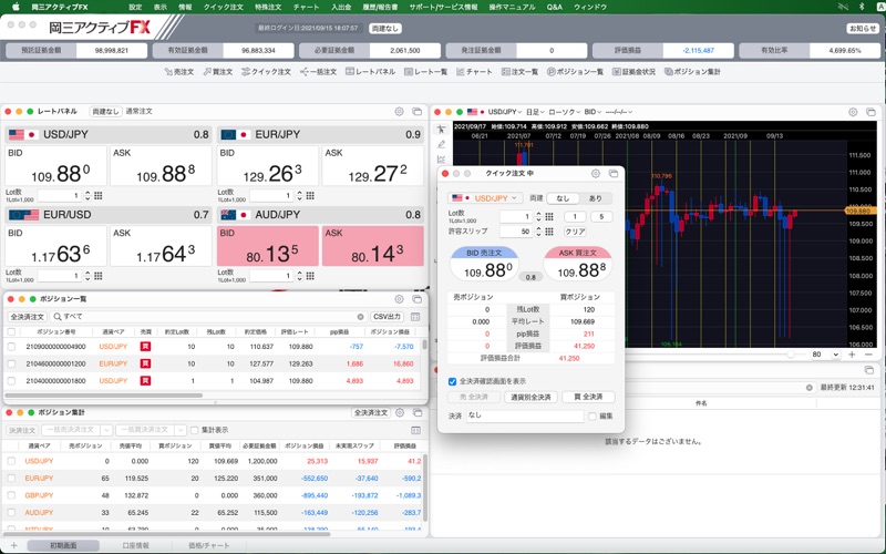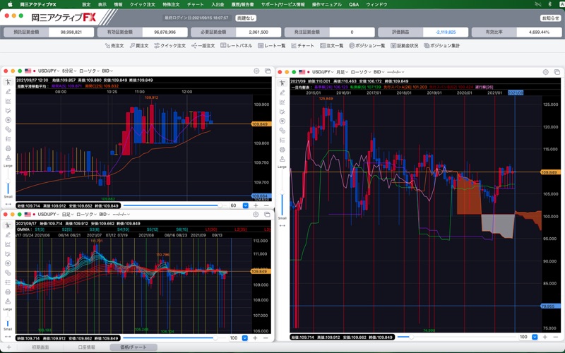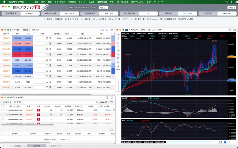 「岡三アクティブFX Mac版」は、Mac OS専用のFXトレーディングアプリです。 ※お取引には、岡三アクティブFX取引口座の開設、取引口座へのログインが必要です。 FX初心者の方からアクティブトレーダーまで投資スタイルに合わせて自由な画面レイアウトが可能です。 ワンクリック注文をはじめとした多彩な注文機能や豊富なテクニカル指標を搭載した高機能チャート、さらにチャート上から直感的に発注できるチャート発注機能など多機能ながら、シンプルな操作でスピーディーなお取引を可能にしました。 1,000通貨からのお取引・魅力的な低スプレッドなど、全てを兼ね備えた「岡三アクティブFX Mac版」をぜひお試しください。 ■主な機能 [業界最狭水準の低スプレッド] 取引コストを最小限に!魅力的な低スプレッド。 [多彩なチャート機能] 豊富な足種とテクニカル指標でチャート分析を強力にサポート。 チャート上からマウス操作だけで、スピーディーに注文が可能です。 ポジションや注文をチャート上に表示できるので、テクニカル分析を行いながら素早く注文が行なえます。 (Tick/1分足/5分足/10分足/15分足/30分足/60分足/2時間足/4時間足/8時間足/日足/週足/月足) [最速のクイック注文機能] 新規・決済・ドテン・同一通貨ペアの全決済注文なども全て1クリックで行なえます。(両建も可能) 平均約定レートや評価損益などのポジション情報も1画面に集約しているので、よりスピーディーなお取引が可能です。 [多彩な注文機能] 成行や指値等のベーシックな注文から、時間指定注文や決済pip差注文など多彩な注文方法をご提供。 ※決済pip差注文とは、新規注文と同時にあらかじめ設定しておいたpip差(値幅)で決済注文を発注する注文手法です。 [投資情報] アジア・オセアニアからニューヨーク市場まで、全世界の取引時間に対応したマーケット情報を、1日約200本のフルボリュームで配信。 ブログや動画コンテンツ等も閲覧でき、いつでもどこでも最新のニュースへアクセスできます。 ■リスクおよび手数料等 当社で取り扱う各商品には価格変動によって損失を被るリスクがあります。また、システム、通信回線等の障害により発注、執行等ができず機会利益が失われる可能性があります。 各商品の取引には手数料・諸経費がかかります。金額は商品や取引条件によって異なります。 各商品のリスク、保証金・証拠金、手数料等の詳細については当社Webサイトをご確認ください。 お取引の最終決定は、契約締結前交付書面、目論見書等およびWebサイト上の説明事項をお読みいただき、ご自身の判断と責任で行ってください。 https://www.okasan-online.co.jp/policy/important.html ■提供会社 岡三証券株式会社 岡三オンライン証券カンパニー https://www.okasan-online.co.jp/ 金融商品取引業者 関東財務局長(金商)第53号 加入協会: 日本証券業協会、 一般社団法人 日本投資顧問業協会、 一般社団法人 金融先物取引業協会、 一般社団法人 第二種金融商品取引業協会、 一般社団法人 日本暗号資産取引業協会 ●機能改善を行いました。