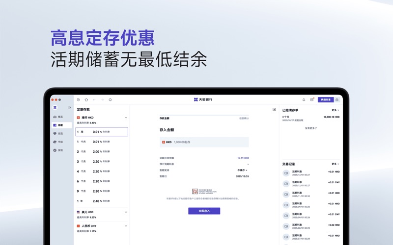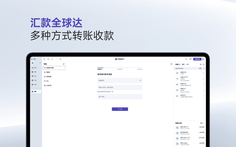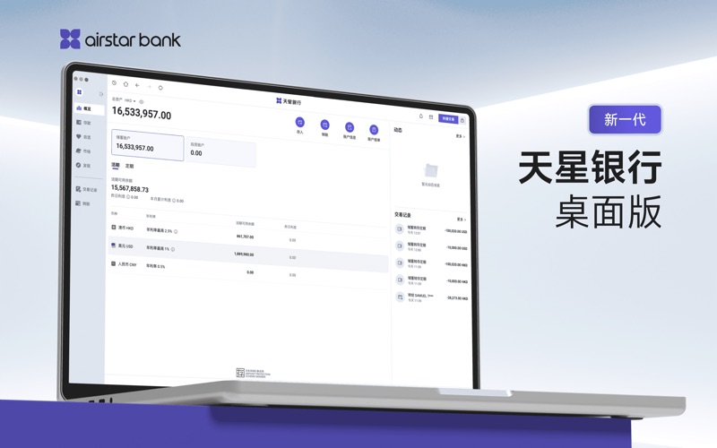 实力雄厚,资质合规 天星银行是由富途集团和小米集团为主要股东的香港数字银行,于 2019 年 5 月 9 日获香港金融管理局颁发银行牌照(银行代码:395)。天星银行始终坚守普惠金融理念,致力于借助金融科技,为每一位客户打造简易、灵活的银行服务体验。 港美双市,一触即投 无需临柜,手机线上开立投资账户;支持碎股交易,小资金亦可玩转港美股;超低费率,投资更省心。 跨境汇款,全球通达 跨境支付通、汇款至中国内地、汇款至全球等多种汇款方式,到账快速,覆盖个人往来、家用红包、国际商务等多元场景,解决您跨境资金流转的各类需求。 转账支付,随心掌控 提供全天候 24 小时港币及人民币即时转账服务,打破时空限制,让资金流转随时响应您的作息。支持按需预约转账,确保准时还款不逾期,精准管理每一笔支出。 更多天星银行的服务及产品介绍可浏览: www.airstarbank.com 「Airstar Bank」应用程序仅供天星银行有限公司之客户使用。就天星银行有限公司未获发牌或授权提供服务的地区而言,「Airstar Bank」应用程序提供的内容及服务非为该等地区的人士而设。 我们持续优化银行服务,为你带来更流畅的金融服务体验。