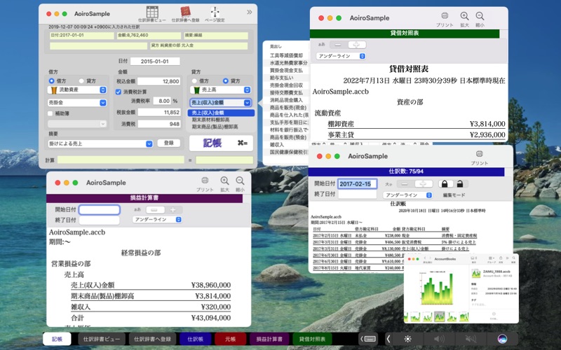 このアプリケーションは、財務会計のデータを複式簿記の形体で電子データとして保存し、保存された電子データを基にして、貸借対照表・損益計算書など各種の集計結果を表示するアプリケーションです。 Apple社製のアプリケーションと共通の操作で操作することができます。従ってMac OS X用の標準的なアプリケーションの操作法についての知識を必要とします。例えば「フォルダ」「マウスクリック」の意味とか、メモリとディスクの相違を理解していることなどです。 借方側・貸方側が左右に分かれた入力形式です。金額は中央で入力します。日付入力はキーボードから短縮入力できます。自動仕訳されます。従って「借方」とか「貸方」の意味など、複式簿記についての基礎知識を必要とします。 手書きの帳票を真似た形式の出力はしません。白紙へプリントアウトして判別できる程度の形式で出力します。伝票番号はありません。そもそも振替伝票などの手書きの帳票を意識していません。科目ごとにつけられたコード番号とかそういう類いのものは一切ありません。 勘定科目名・補助簿科目名の登録や、摘要辞書登録仕訳辞書の登録など入力補助の機能があります。アンドゥ・リドゥ機能が付いています。仕訳の修正・削除も可能です。 仕訳帳・元帳・損益計算書・貸借対照表・日次残高推移表などは仕訳入力とほとんど同時にリアルタイムに集計されて表示されます。 いくつかの細部を修正した。