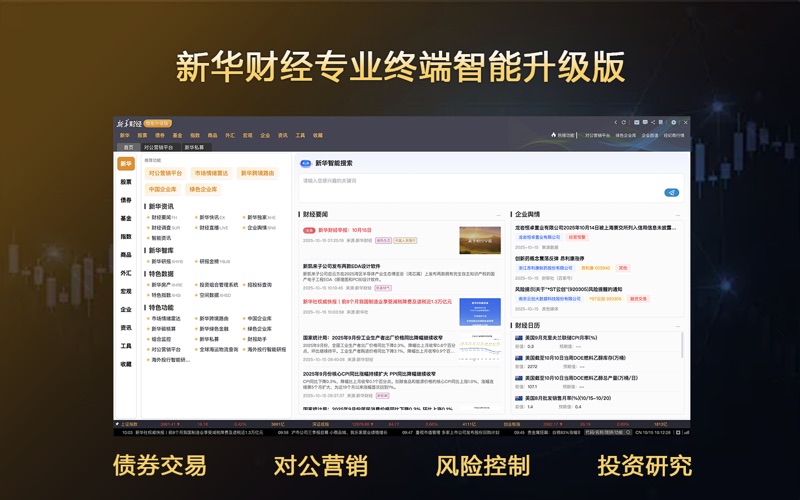 【本终端须拥有新华财经专业终端(智能升级版)账号方可使用】 如果您是“金融专业人员”,但尚无新华财经专业终端(智能升级版)账号,请致电400-6123115,咨询账号购买事宜。 如果您是“个人投资者”,请在手机应用商店搜索“新华财经APP”,同样获取专业、权威、及时的资讯和行情。 新华财经专业终端(智能升级版)是在现有基础版的资讯、数据、行情、研报、分析工具及交易信息六大核心能力之上,聚焦“债券交易 + 对公营销 + 风险控制 + 投资研究”四大业务场景,致力于为用户提供全业务链智能信息服务。 ---------------核心亮点--------------- 【债券交易】债券市场实时“晴雨表”,直观体现买卖力量方向 【对公营销】赋能对公业务全周期——获客、识客、鉴客 【风险控制】风险信号动态捕捉,防控模式主动进阶 【投资研究】股权投资全流程,私募尽调新视野 对新华财经产品如有任何疑问或建议,请联系:xinhuacaijing@xinhua.org 1. 修复已知问题 2.交互体验优化