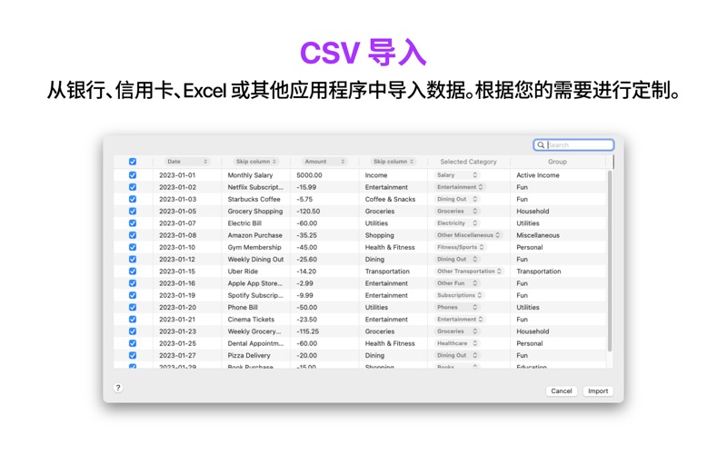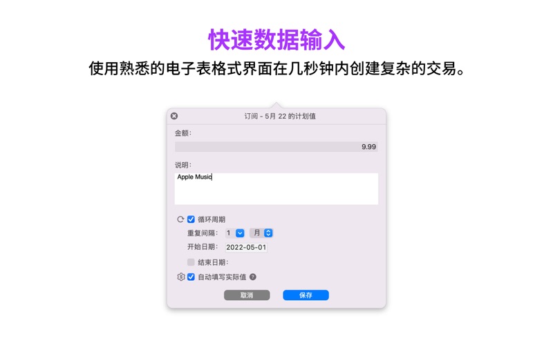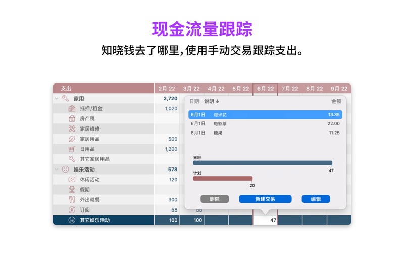 “使用此应用程序几天后,我发现,我从没有比此刻更加清楚我的财务状况啦!” 您可以通过下列方式控制您的财务: > 清晰预测:高水平预览您的财务状况,并从中获益,从而预估即将发生的变化,例如,生小孩、新房子或退休等。 > 轻松预算:Cashculator 采用熟悉的电子表格概念,可按类别进行轻松预算,加上“假设”场景比较等功能,是最简单的个人财务管理方式。 > 现金流跟踪:不要再想您的钱花到哪里去了,通过手动交易,跟踪您的支出状况吧。 > 隐私保护:您所有的个人财务信息都会安全地保留在您的 Mac 上。 > 快速输入数据:使用您熟悉的电子表格式界面,只需几秒即可创建复杂的交易。 > 详细报表:使用易于理解的图表和表格查看您的收入、支出和余额。 > 键盘快捷键:全键盘支持,可快速浏览交易! “这是一个非常出色的工具,可迅速帮我摆脱大量债务” 关键概念: * Cashculator 将计划数据和实际数据分开,因此您可以看到您的实际财务情况与计划相比较的情况。 如果您的目的在于计划,那么,就不需要输入实际交易。 * Cashculator 使用您熟悉的电子表格呈现数据。通过此表格,您可以看到一段时间内您的财务状况。从每月或每周(或每年)这一列进行选择以生成报表。 * 通过窗口右下方的“范围”控制,可以选择显示在表格和报表中的、基于当前日期的过去或未来的某一段时间。还可以根据需要在表格中添加或删除列。 * “对账”屏幕可对您的实际“真实”余额(银行账户上的总余额 + 现金)与应用程序内的这一数值进行比较,而且,如果需要,还可以将应用程序内计算出的总余额替换成实际余额(数值越精确,未来计算越准确)。或者,如果需要 Cashculator 实现精确跟踪,您可以更新 Cashculator 中的交易,完成实际余额与应用程序内余额的对账。 * 每个 Cashculator 文档都可以创建多个场景(从头开始创建,或是通过复制现有场景进行创建),然后稍微更改一下,对计划进行对比,看看有什么不同。 免费版本支持最多五个收入和五个支出类别。完全解锁版本可通过订阅获得。 由Mac用户为Mac用户精心制作。 Terms of Use: https://cashculator.app/terms-of-use/ Privacy Policy: https://www.apparentsoft.com/privacy 本次更新新增交易附件功能,加快并优化CSV导入,并修复多项界面问题。 感谢所有反馈并协助我们修复问题的用户。 新增:交易附件现在可以直接为每笔交易保存票据、发票和相关文档。 - 将文件拖放到任意交易即可添加附件 - 使用快速预览即时查看附件内容 - 附件安全保存在你的 Cashculator 文档中 - 可在交易编辑器和快速查看窗口中查看附件 - 特别适合需要提供报销或报税消费凭证的场景 改进:CSV 导入速度更快。 改进:CSV 导入现在可正确处理包含时间信息的日期列(例如:“2025-12-01 14:30:00”)。 改进:CSV 导入现在会遵循你所在地区的小数点和负号格式设置。 改进:类别分布报告中的“最高交易”面板,在查看跨多个月或多年的区间时,会显示更清晰的日期范围(例如:“2024年12月 - 2025年1月”)。 修复:“最高交易”面板在已过去的时间段中错误显示计划金额而非实际金额的问题。 修复:在折叠分组中点击带有类别的交易时无法正确选择类别的问题——现在会自动展开对应分组。 修复:在“双列表视图”中右键菜单里的“在此类别内创建类别”选项有时显示错误类别名称的问题。 欢迎持续向我们反馈建议!
