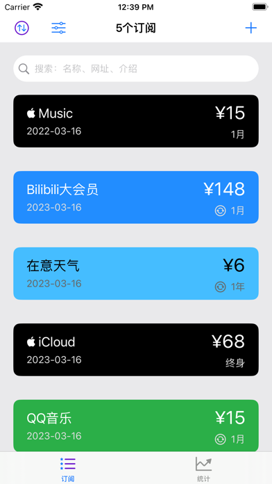 1. 轻松记录全部订阅账单。 2. 统计平均每日、每周、每月和每年花费。 3. 支持iCloud同步全设备。 1. 新增归档功能。 2. 新增是否自动订阅和终身购买选项,统计功能也分开统计。 3. 新增分类和筛选功能。 4. 新增网址功能。