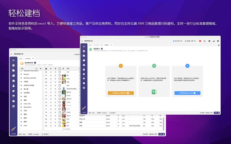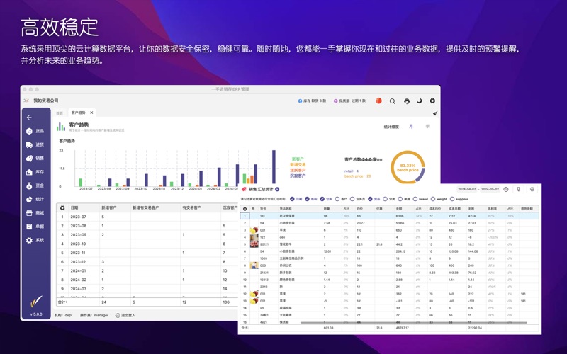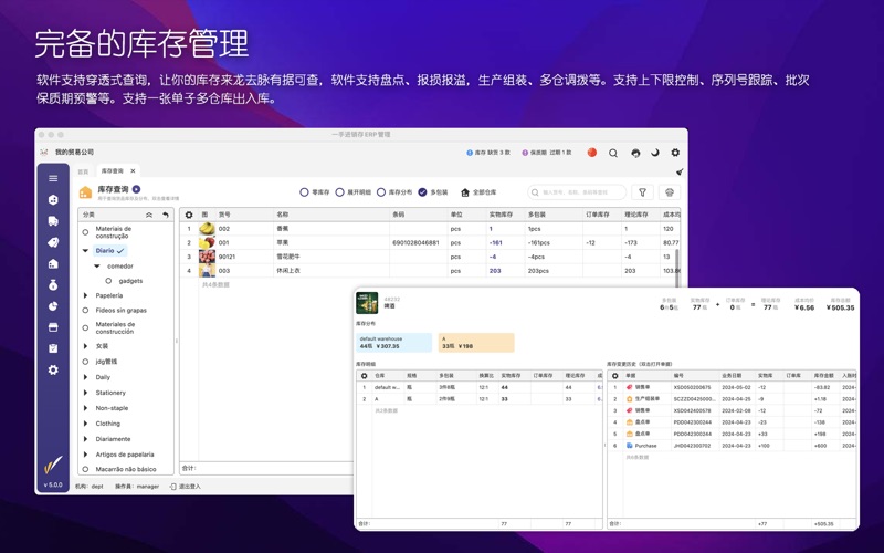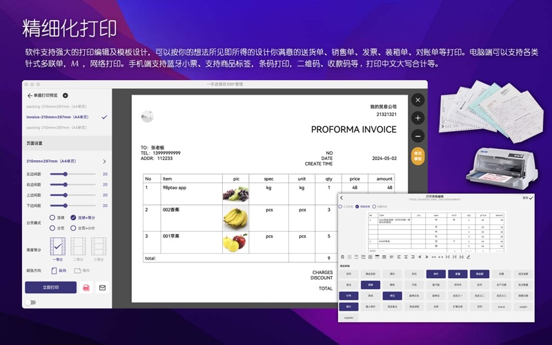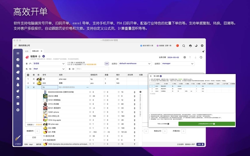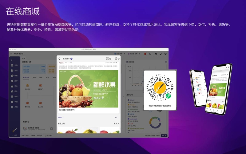 主要用途: 1、电脑做账、扫码入库、手机开单,现场报价。解决传统手工开单记账,库存不清、价格不清、低效易错。 2、针式打印多联送货单、销售单、蓝牙打印小票、商品吊牌标签打印、打印内容可任意编辑。 3、实时跟踪商品库存及多门店分布,掌握库存变更历史。全面理清供应商及客户往来欠款及过往流水账。 4、记录你企业每一笔收支费用,理清内账外账。汇总和分店核算财务利润及员销售业绩等。 5、进销存财全流程管控。多门店销售业务数据共享,总部汇总调度配送,可控制门店人员数据权限。 6、配套微信小程序商城,让您的顾客用微信就可轻易订货,补货。货品分享,新品批量推款,拓展在线营销渠道。 7、多语言,多币种,多终端全面适配,支持手机、windows,mac,pad等一起使用。 8、软件简单易用,配套完整详细帮助视频。提供1对1专属客服服务。 适合行业: 服装、五金建材、快消品、食品生鲜、日用百货、玩具文具、化妆品、母婴、汽配等行业。 功能概要: 【全流程管控】:系统配备弹性可伸缩架构。伴随你生意的做大,都能提供由浅入深的功能体验。无论是单店的精致零售,还是追求高效批发业务,甚至多店连锁加盟企业。都能在产品中找到适合自己的定位。高效管理进货、销售、库存、资金业务,是新一代移动ERP精品软件。 【高效开单】:软件支持电脑端货号开单,扫码开单,excel导单,支持手机开单,PDA扫码开单、配备行业特色的批量下单的等。支持单据复制,转换,回溯等。支持客户多级报价,自动跟踪历史价格和欠款。 【完美打印】:软件支持强大的打印编辑及模板设计,可以按你的想法所见即所得的设计你满意的送货单、销售单、对账单等打印。电脑端可以支持各类针式多联单,A4 ,网络打印。手机端支持蓝牙小票、支持商品标签,条码打印,二维码、收款码等。支持自定义公式列,支持类似重量,体积,面积等数据打印。 【强化库存】:软件支持穿透式查询,让你的库存来龙去脉有据可查,软件支持盘点、报损报溢,生产组装、多仓调拨等。支持上下限控制、序列号跟踪、批次保质期预警等。多仓库出入一张单子搞定。 【轻松建档】:软件支持各类资料的excel导入,方便快速建立货品、客户及供应商资料、同时也支持云端3500万商品数据扫码建档、支持一些行业标准数据模板,智能粘贴识别等。 【资金财务】:软件支持多门店独立核算,多仓库独立成本。支持客户供应商分期账款及往来核销,支持企业内部部门费用记账,配备门店收支,销售日报及利润核算及资产负债等数据统计。 【在线商城】:进销存的数据直接可一键分享货品给顾客等、也可自动构建微信小程序商城,支持个性化商城展示设计。实现顾客在微信下单、支付,补货、退货等,配套开展优惠券、积分、特价、满减等促销活动。 【高效稳定】:系统采用顶尖的云计算数据平台,让你的数据安全保密,稳健可靠。随时随地,您都能一手掌握你现在和过往的业务数据,提供及时的预警提醒,并分析未来的业务趋势。 【国际化】:支持中文简繁、英、西、葡、日、印尼,越南、泰国等多国语言。直连世间各区域的服务器,畅享国际互联,定制各地区的数字货币种类和显示风格及本地化时区等。 1. 新增国际版商城,支持电脑端网页商城,html5手机商城,支持商城业务分享到WhatsApp等更多的社交平台 2. 商城版增加按钮区功能,并且包括轮播图增加跳转链接功能 3. 国际版及微信小程序增加多级分类选择和展开功能 4. 限时折扣增加客户类型选择控制,完善商城限时折扣,满减及特价处理相关环节 5. 新增网页商城推广码管理 6. 完善微信小程序的微信支付及相关控制功能 7. 标签打印支持300DPI打印机,支持按照序列号打印多张标签,标签打印支持云打印,完善二维码打印 8. 完善带页边距单据的打印问题,完善图片分享边距显示问题。完善打印网格线显示问题,完善批量打印模板匹配问题,网格列头文字支持多行 9. 完善销售回款相关统计 10. 完善订金分批核销及回溯功能,完善订单结算处理。完善收款单相关处理方式 11. 增加员工excel导入导出权限控制、完善excel商品导入默认价格,完善excel导入客户名称包含特殊字符相关问题 12. 完善客户对账相关查询统计,增加对账单均价显示,完善排序及合计显示问题,分离数量,单位,规格的显示,方便导出和计算 13. 增加货号显示控制功能,完善商城原分类不匹配问题 14. 单据中心增加客户地址和联系方式的筛选功能 15. 增加客户商城资料管理,增加客户来源及最近浏览时间,浏览情况统计等 16. 增强计算列关于税率、含税金额的处理,完善计算列相关计算和合计处理 17. 完善科目明细表和账户收支表相关查询处理 18. 完善费用科目太多带来的显示重复问题 19. 完善单据制单人发货人等显示问题 20. 完善库存查询中订单库存的筛选问题 21. 完善客户交易、收款、欠款等显示问题 22. 增加订单执行及单据下单后,备注信息可带入及复制处理 23. 增加WhatsApp客服功能 24. 进货类单据增加抹零功能。共用销售类抹零配置参数。 25. 多包装单位允许多个换算比为1的规格存在。 26. 调单功能增加单据编号的筛选 27. 其他bug完善及性能优化。