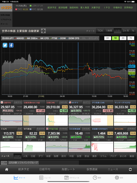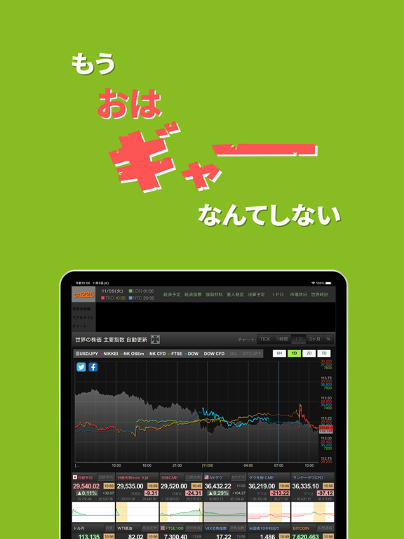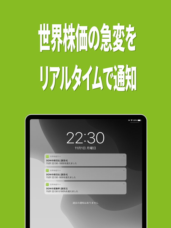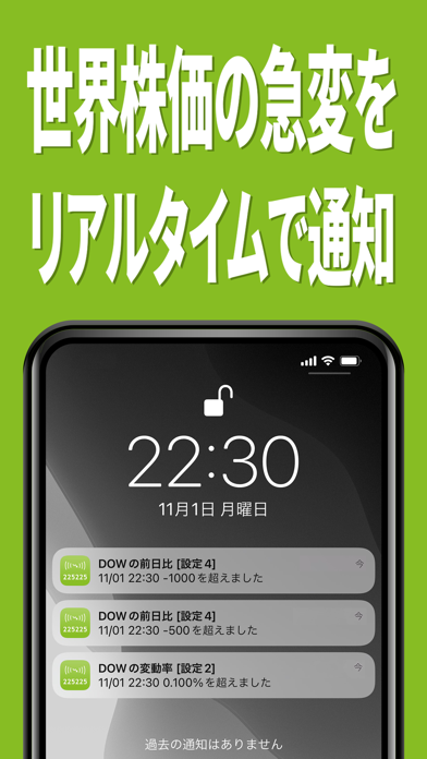 頻繁な相場チェックが不要になる!世界の株価の暴落や急騰をプッシュ通知するアプリです! 無料でリアルタイムに日経平均株価、日経平均先物、NYダウ、為替ドル円、原油価格、仮想通貨ビットコイン等の重要指数を確認することが出来、大きな変動が発生した時にはプッシュ通知でお知らせします。 このアプリをインストールしておけば「海外の相場の急変に気付かかった( ノД`)」なんてことが激減します。 ・日経平均株価の前日比100円で設定をすると 前日比が・・・-300円 -200円 -100円 +100円 +200円 +300円 ・・・を超えた時に通知をします。 ・大きな変動だけアラームが欲しい場合には設定画面で前日比200円に変更すれば 前日比が・・・-400円 -200円 +200円 +400円・・・を超えた時に通知をします。 為替ドル円の場合には直近10分間での変動率を通知し、相場の急変をいち早く察知することが出来ます。 ※アプリをインストールする際に必ず通知設定を許可するようにして下さい。 ■アラート対応指数 ・日経平均先物・日経平均株価・NYダウ・NASDAQ・FTSE100・上海総合・米国債10年利回り・ドル円・ユーロ円・ユーロドル・豪ドル円・ポンド円・WTI原油先物・金先物・ビットコイン円・イーサリアム円・VIX恐怖指数・日経平均CFD・NYダウCFD 2.5.1 ・設定画面のスマホ版に、旧スマホ版表示への切り替えを追加しました。 2.5.0 ・ランドスケープモード時の画面サイズを修正しました。 2.4.9 ・軽微な修正 2.4.8 ・チャートタブでSlideOver時メニューバーが表示されないことがあったのを修正 2.4.7 ・ユーロ円の変動率の初期設定と低頻度設定をOFFに変更しました ・その他軽微な修正 2.4.6 ・メニューバーの表示を修正しました。 2.4.5 ・ダークモード時のタブバーの表示を修正しました。 ・その他軽微な修正 2.4.4 ・経済指標アラームの設定をアラート設定に移動しました。 ・経済指標アラームの重要度が5段階に変更になりました。 ・米国債10年利回り、WTI原油先物、金先物、ビットコイン円、イーサリアム円の通知される変動率を変更しました。 ・その他軽微な修正 2.4.3 ・変動率%の通知と設定に表示上の誤りがありました。 実際の変動率の1/4の表示となっていた為、 正しい4倍の数値に変更しました。 表示上の修正であり通知頻度は今までと変わりません。 ・その他軽微な修正 2.4.2 ・履歴画面の動作を改善しました 2.4.1 ・NASDAQ、マザーズの変動率の初期設定と低頻度設定1をそれぞれ0.150%->0.250%、0.250%->OFFに変更しました ・履歴画面の動作を改善しました ・設定画面にバージョン履歴の追加しました ・iPad版不具合の修正 2.4.0 ・アラート設定の通知頻度設定タイプを追加 ・その他軽微な修正 2.3.0 ・変動率の+ー表示に対応しました。 ・履歴画面の表示を改善しました。 ・その他軽微な修正 2.2.0 ・日経CFD(日経比)、NYダウCFD(DOW比)、マザーズ、NASDAQ、米国債10年利回、金先物、イーサリアム円、豪ドル円、ポンド円、のプッシュ通知追加 ・その他軽微な修正 2.1.1 ・マルチタスク対応 ・ニュース欄のリンク不具合修正しました ・その他軽微な修正 2.1.0 ・履歴画面、通知からチャートページと経済指標ページへの遷移追加 ・通知に設定しているレベルを追加 ・履歴画面に経済指標の履歴を追加 ・その他軽微な修正 2.0.0 ・日経平均先物、VIX恐怖指数、ユーロ円、ユーロドルのアラート通知に対応しました。 ・アラート設定を3段階から4段階に増やしました。 ・横向きでフルスクリーンチャートを表示するランドスケープモードを追加しました。 ・チャート表示にPC版(nikkei225jp.com)表示を追加しました ・アラート通知の登録処理修正