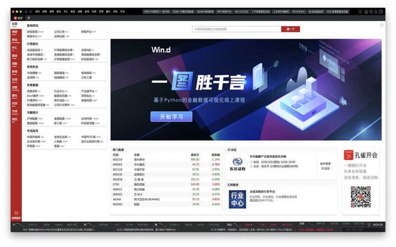Wind金融终端是一款面向金融专业人士提供金融数据、信息资讯、分析工具、组合管理和协作交流于一体的一站式工作平台,目前在全球拥有数十万实名认证的金融机构从业用户使用。Wind金融终端于本世纪初面市,经过长达二十年的持续迭代及打磨,数十亿软件研发投入,以其丰富的内容、强大的功能和卓越的服务,已经成为投资研究中国和全球资本市场的必备选择,获得各类用户的广泛赞誉。 Wind金融终端数据内容涵盖股票、债券、商品、外汇、基金、指数、衍生品等数百万金融产品,数据历史最早追溯至1896年,提供千万级指标科目及PB级数据存储量的海量信息,几乎涵盖所有金融数据。Wind金融终端服务于资产管理、投资银行、财富管理、产业投资、市场监管、学术研究等各类型业务;客户包括商业银行、证券公司、保险保险、资产管理公司、上市公司、金融监管机构、各类政府机构、财经媒体等几乎所有参与或关注资本市场的机构或企业。Wind金融终端支持全周期服务,用户可以7×24×365获取到及时、准确、完整的财经数据、信息和各种分析结果,以及VIP级别的客户服务。Wind金融终端支持全平台通道,用户可以随时随地通过Windows、Mac、Linux、银河麒麟、统信UOS、手机端或Pad端获取最新的信息。 【修复】程序崩溃问题修复 【修复】其他已知问题修正
