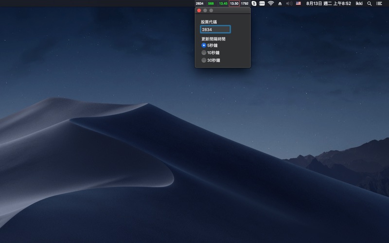 顯示股票目前買賣價與買賣盤. 可點擊再顯示買賣各五檔訊息. 快速掌握買賣時機. 直接顯示數字在狀態列. 可設定5,10,30秒更新頻率 可設定上市或上櫃股票. 支援紀錄多組股票,可快速切換,並可自動輪流顯示. 第一次開啟需要時間下載資料, 待10~15秒後重啟軟體即可正常. 修正第一次進入無法正常產生預設股票列表