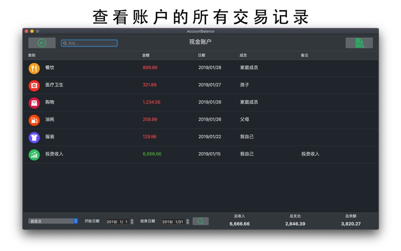 记账本AccountBalance - 快捷地记录每个账户的收入与支出,可帮助您跟踪多个账户的支出和监控余额。 很简单易用,首先添加一个账户,然后在账户中添加收入与支出交易。 ►iCloud云备份和同步功能,确保数据的安全性和跨设备访问数据。 ►简单但功能强大。 ►界面简洁,同时为您提供管理财务所需的功能。没有更多,没有更少。 ►只需点击几下即可输入新的收入或费用条目。 ►您的所有交易信息一目了然。 ►跟踪多个账户:支票,现金,储蓄,信用卡,其他......等。 ►无限制添加账户,可选5个账户类型(支票,现金,储蓄,信用卡,其他)。 ►无限制添加收入类别和支出类别,并且可以选择类别图标。 ►无限制添加收款成员(交易对象)。 ►轻松导出CSV格式的Excel数据。 ►您可以导出不同账户、不同收款成员、自定义日期范围内的CSV数据。 ►详细报告,以真正了解您的财务状况。 ►使用图表统计信息来了解您的资金用途。 ►所有数据都存储在您的电脑上;并可以使用密码保护,只有您才能访问。 ►提供了用户使用手册。 通过App的支持页面直接与我们联系,您将得到快速回复。 Bugfixs