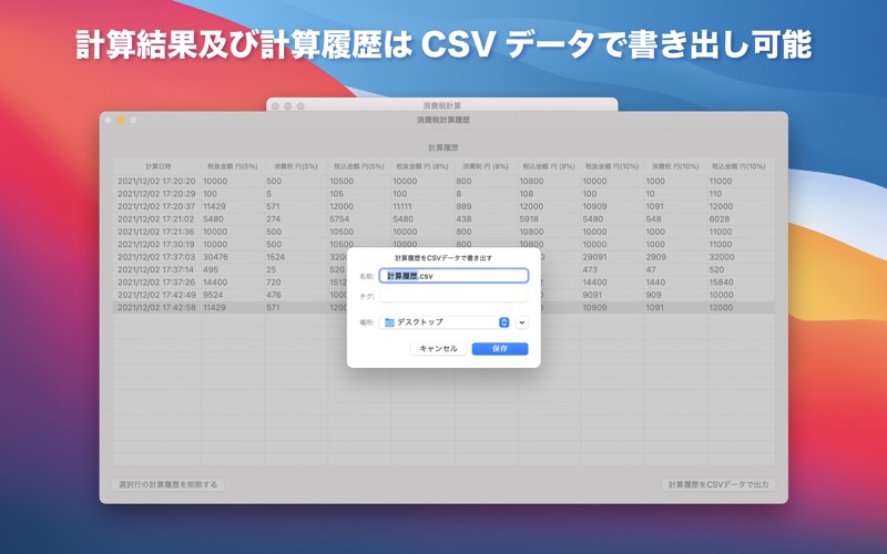 「かんたん消費税計算」は、入力した金額からワンクリックで消費税や内税・外税金額を、5%、8%、10%の税率ごとに計算して管理することができるアプリケーションです。 税抜金額や税込金額を入力していただくことで、消費税、内税金額、外税金額を、税率ごとに一括で求めることができます。 小数点以下端数処理として、切り上げ・四捨五入・切り下げ計算にも対応しています。 また、計算履歴画面にて、過去の計算結果を表示、管理することができますので、消費税額や内税・外税金額を比較検討することができます。 本アプリケーションはオフラインで使用できるので、外出先や取引先といった、インターネット環境が存在しない場所でも、快適にご利用いただくことができます。 「CSVデータの出力への対応」 求めた計算結果や計算履歴一覧の表は、ワンクリックでCSVデータとして書き出すことができます。お手持ちの表計算ソフトでのご活用等にお役立て下さいませ。 本アプリケーションが、皆様の日々のビジネスシーンや生活にお役立ちできれば幸いです。