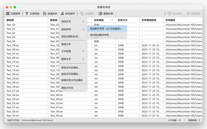 本软件可以方便快速的批量修改文件名、目录名。 Version 1.0.0版本 - 支持自定义文本的添加、替换和删除。 - 支持数字序号的添加,自动补0和自定义起始序号。 - 支持批量文件后缀名的添加、修改和删除。 - 支持当前日期、自定义日期的添加。 - 支持操作回退,修改名回退操作。 - 支持快速命名方式。 - 支持英语和中文界面,亮色和暗色主题风格。 ============================= This software can easily and quickly batch modify file name, directory name. Version 1.0.0 version - Support for adding, replacing, and deleting custom text. - Support the addition of numeric sequence number, automatic 0 and custom start sequence number. - Add, modify, and delete file name extensions in batches. - Supports the addition of current date and custom date. - Supports operation rollback and name change rollback. - Supports quick naming. - Support English and Chinese interface, bright and dark theme style.