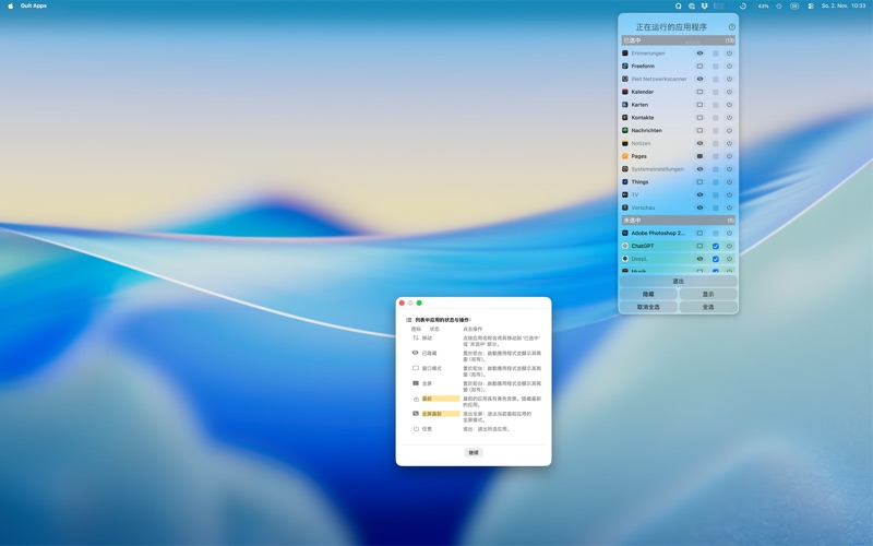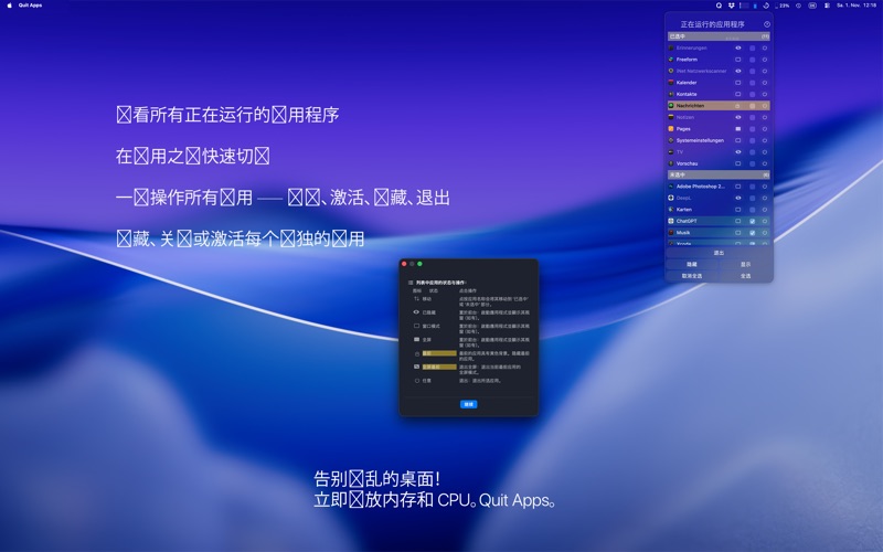 Quit Apps 是一款应用管理器。它将所有正在运行的应用集中显示在一个地方,并通过图标显示其当前状态(隐藏、窗口化、全屏或前置)。您可以通过点击相应的图标,一键或单独关闭、隐藏或前置它们。 随着时间推移,许多 Mac 应用会保持打开并在后台运行。Quit Apps 帮助您一键关闭所有这些应用,释放系统资源,让您的 Mac 自由呼吸! 告别杂乱的桌面! 立即释放内存和 CPU。 Quit Apps 会记住您的选择,为您节省时间。活动中的应用将继续运行,而不必要的应用将不再拖慢系统。 它非常适合专注工作和保持桌面整洁。还可为您提供当前所有运行应用的概览。 一键隐藏、关闭或激活所有应用!快速切换应用。 无需订阅 — 一次性购买,终身更新。 由 BananaGlue 团队倾情打造。 - 点击应用名称将其置于最前端。 - 点击应用图标进行选中或取消选中。 - 优化双显示器使用体验。 - 修复 macOS 26 Tahoe 相关问题 - 底层功能增强 尽情享受吧!